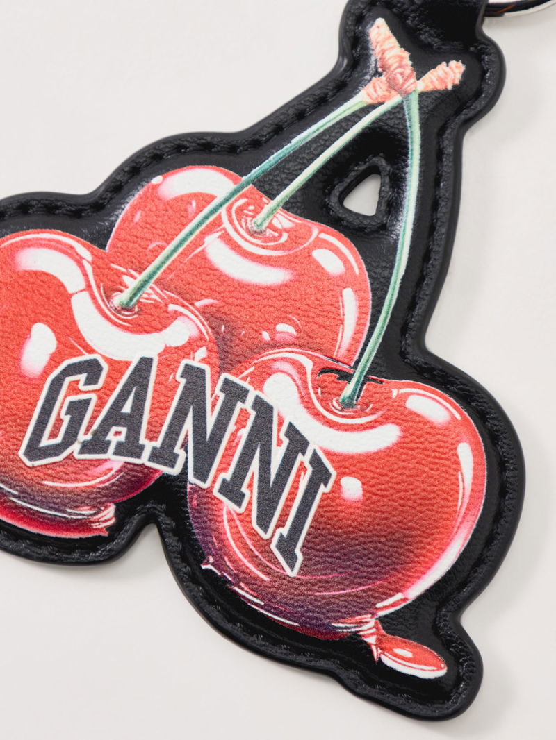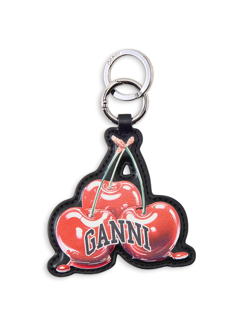 The Cherry Enamel Keyring Black by Ganni introduces a sculpted, glossy finish in a bold graphic motif. A standout miniature designed to bring charm to bags and keys alike.