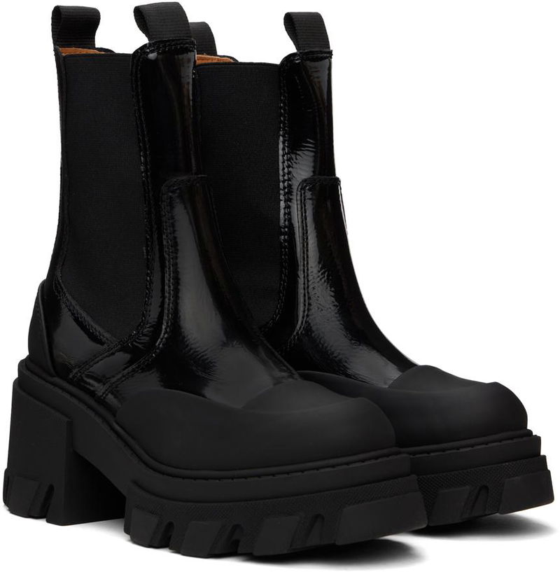 Mid-calf crinkled patent leather Chelsea boots in black.· Rubber cap toe· Grosgrain pull-loops at collar· Elasticized gusset at sides· Rubberized logo at heel tab· Logo embossed at heel counter· Buffed faux-leather lining· Treaded rubber sole.