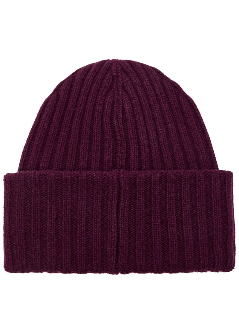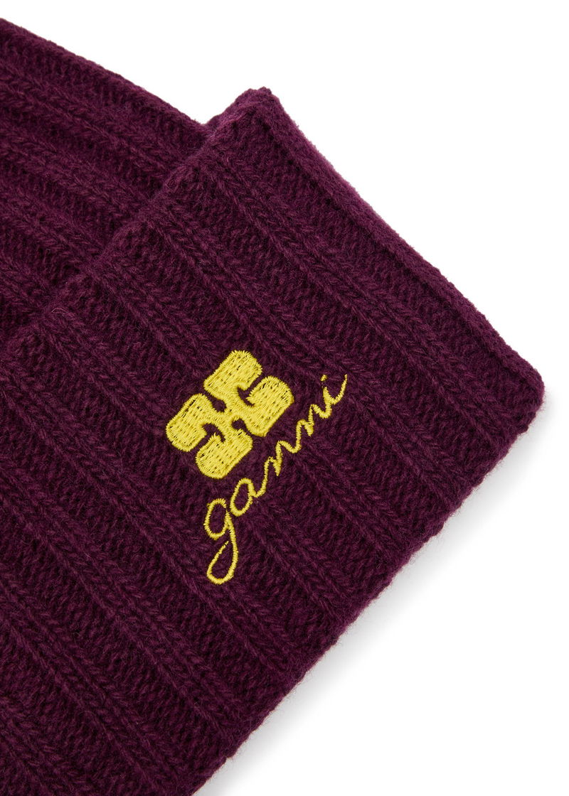 GANNI wool-blend beanie.Ribbed, logo embroidery at turn-up cuff.