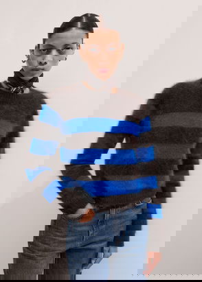 Glistening crystal-embellished buttons at the shoulder of Ganni’s ivory sweater capture the label’s charming aesthetic. It’s knitted from sublimely soft cashmere with black stripes, then finished with ribbing at the round neck, cuffs and hem. Wear it with denim for a relaxed approach to weekend dressing.