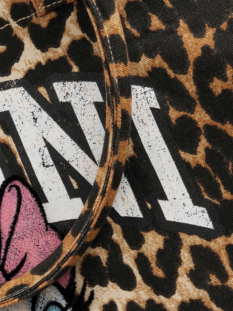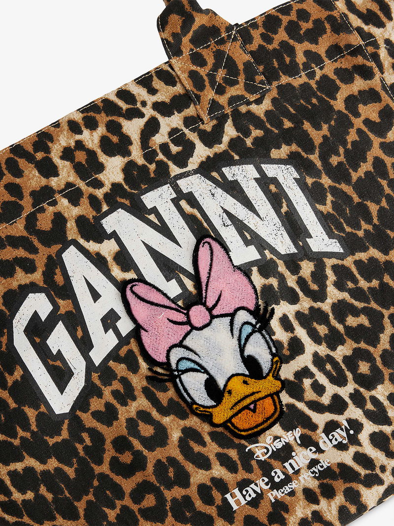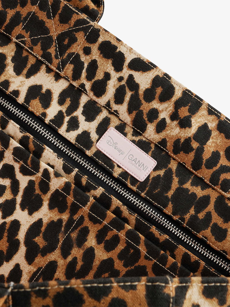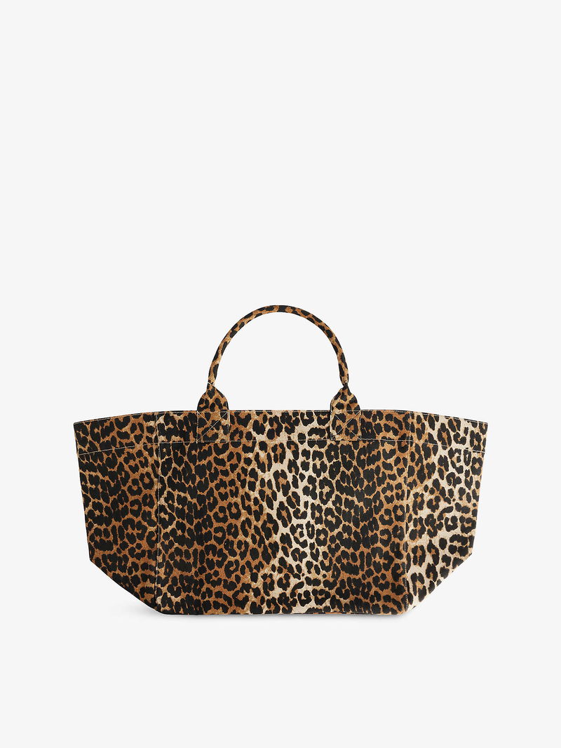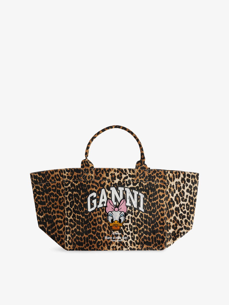 Ganni cotton shopper. Twin top handles, graphic print design at front, all-over leopard pattern, one main compartment, one interior zipped pocket, one interior patch pocket.