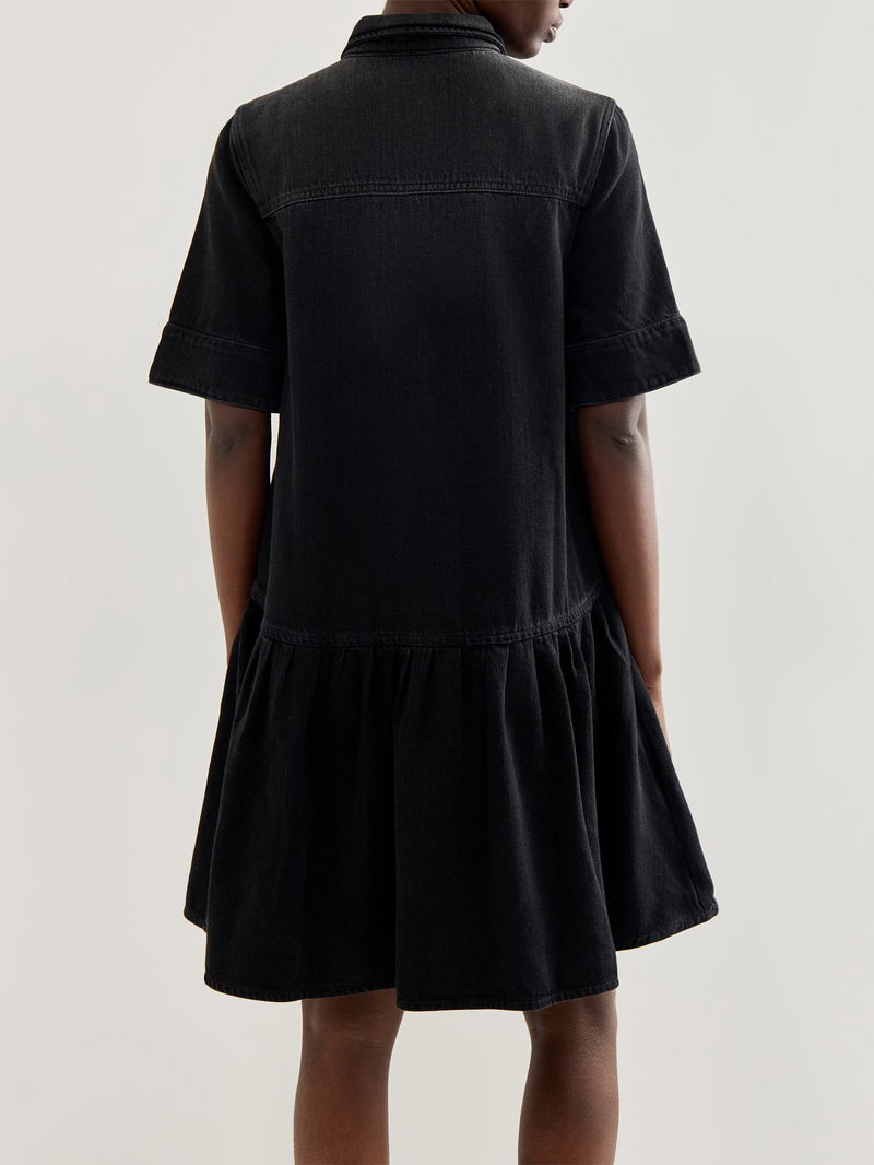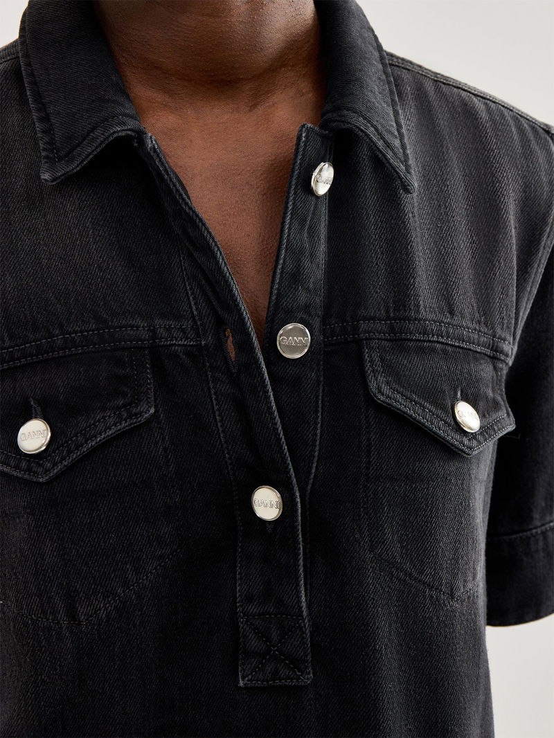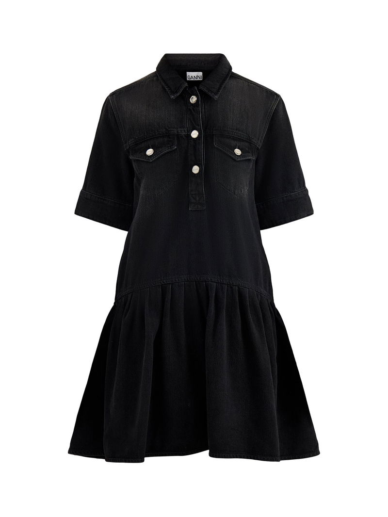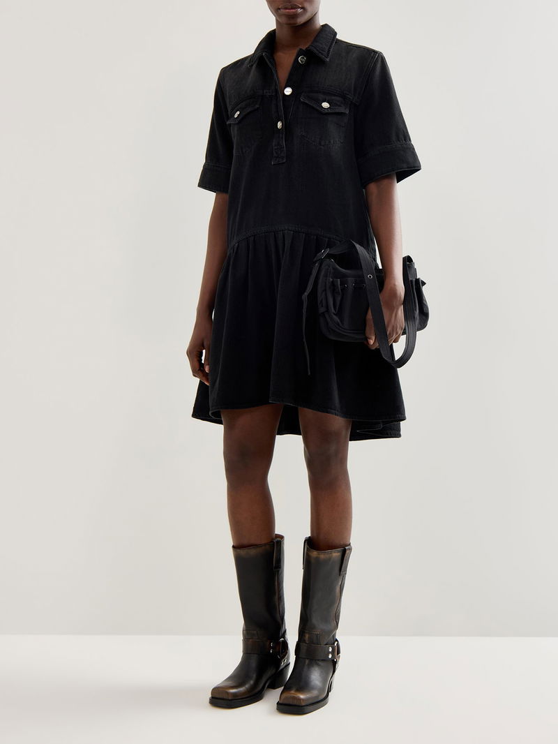 The Denim Mini Dress Blue by Ganni is cut from structured cotton denim with contrast topstitching that defines the silhouette. Short sleeves and utility seams hold shape while allowing movement. Layer this denim mini dress over roll-necks for winter or wear solo in spring.