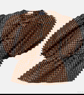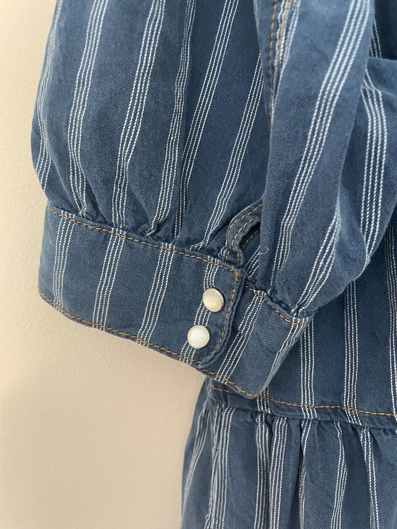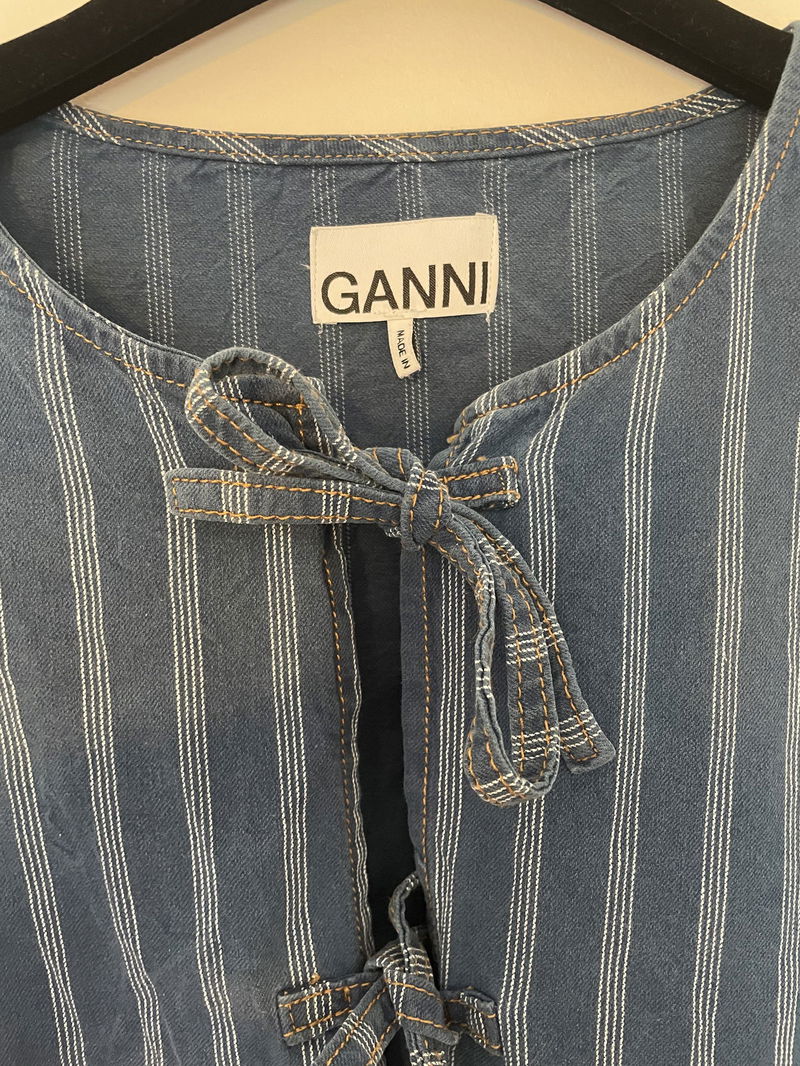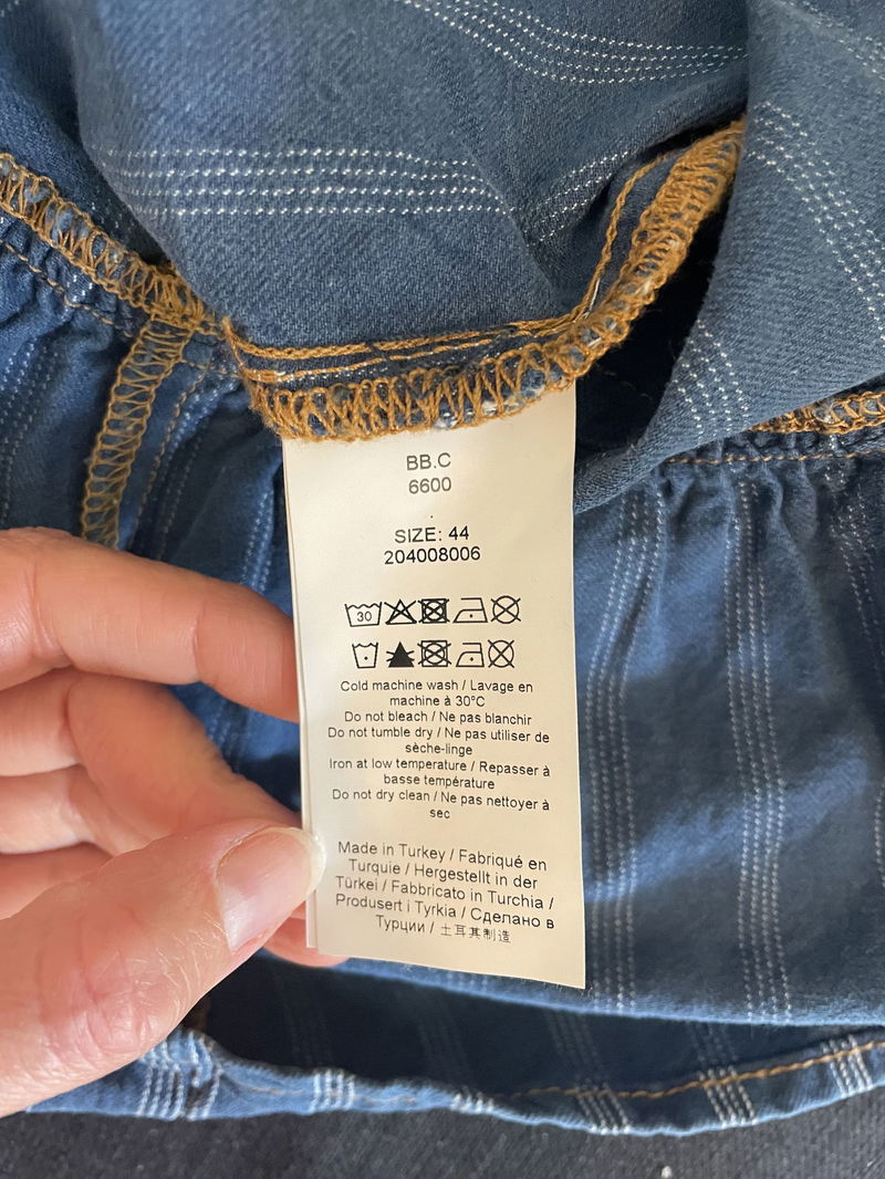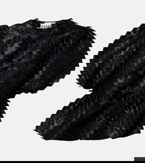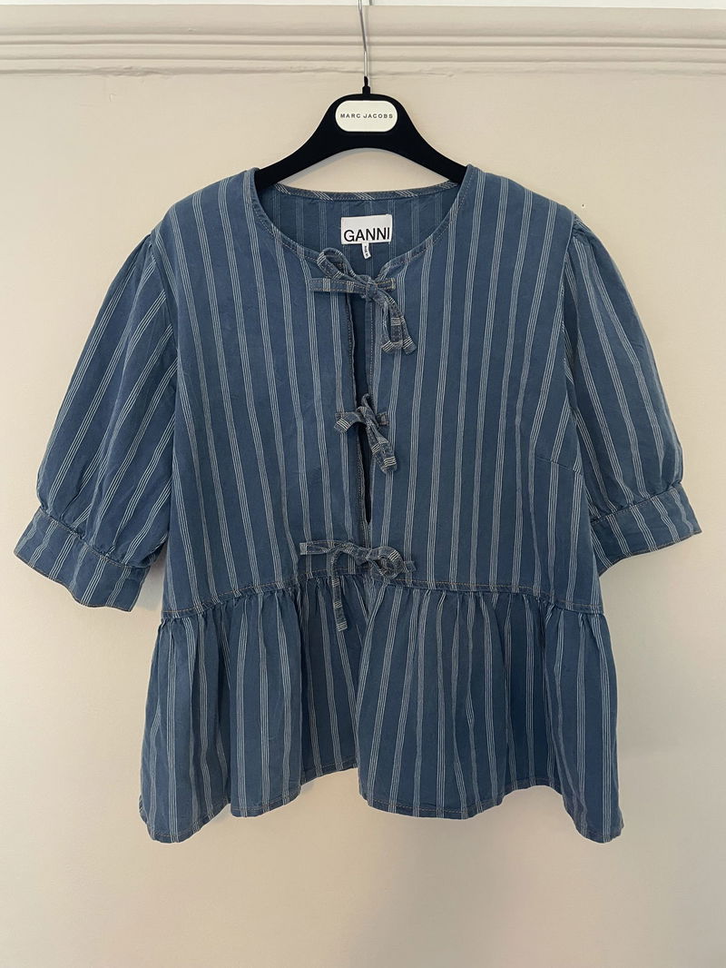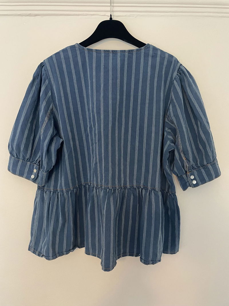 =This Denim Peplum Blouse is made from certified organic cotton. The blouse features an open round neckline with tie closures and slightly puff sleeves with snap buttons. Designed for a straight fit with a peplum silhouette.