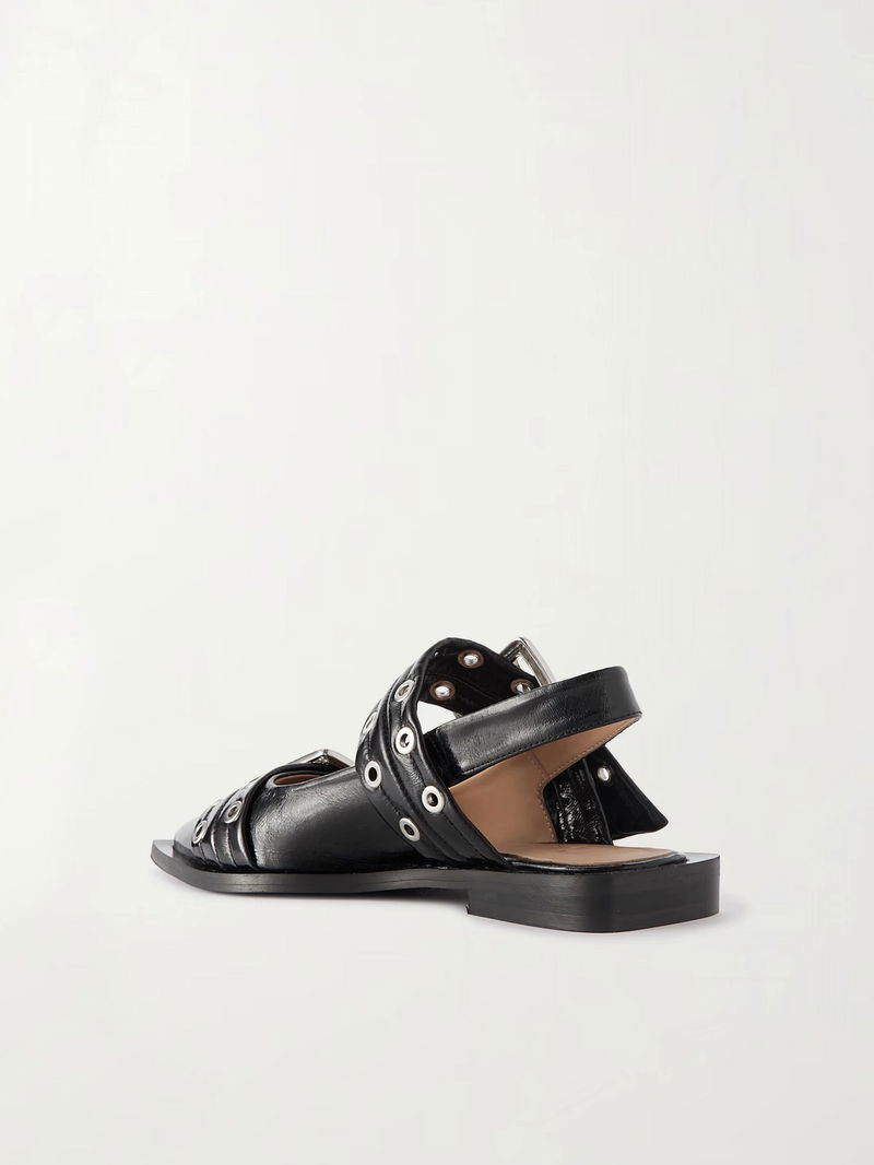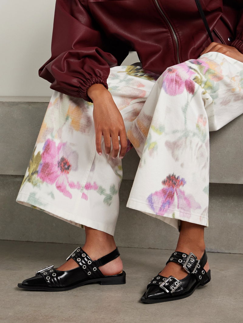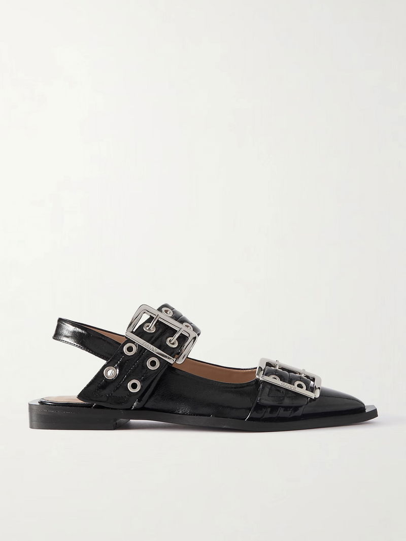 GANNI's slingback ballet flats are the perfect way to toughen up a romantic dress. Crafted from glossy recycled synthetic material, they have eyelet-embellished buckled straps and sleek pointed toes. They look great with relaxed denim, too.