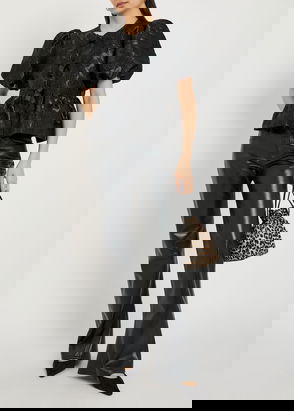 Organic cotton poplin blouse. Floral pattern printed throughout. · Round neck· Self-tie closure · Gathering at peplum hem· Puff sleeves· Elasticized cuffs.