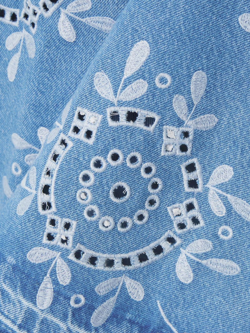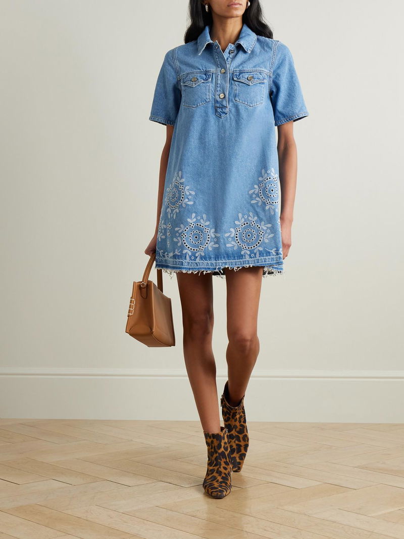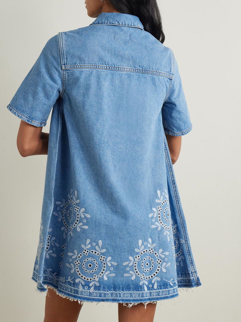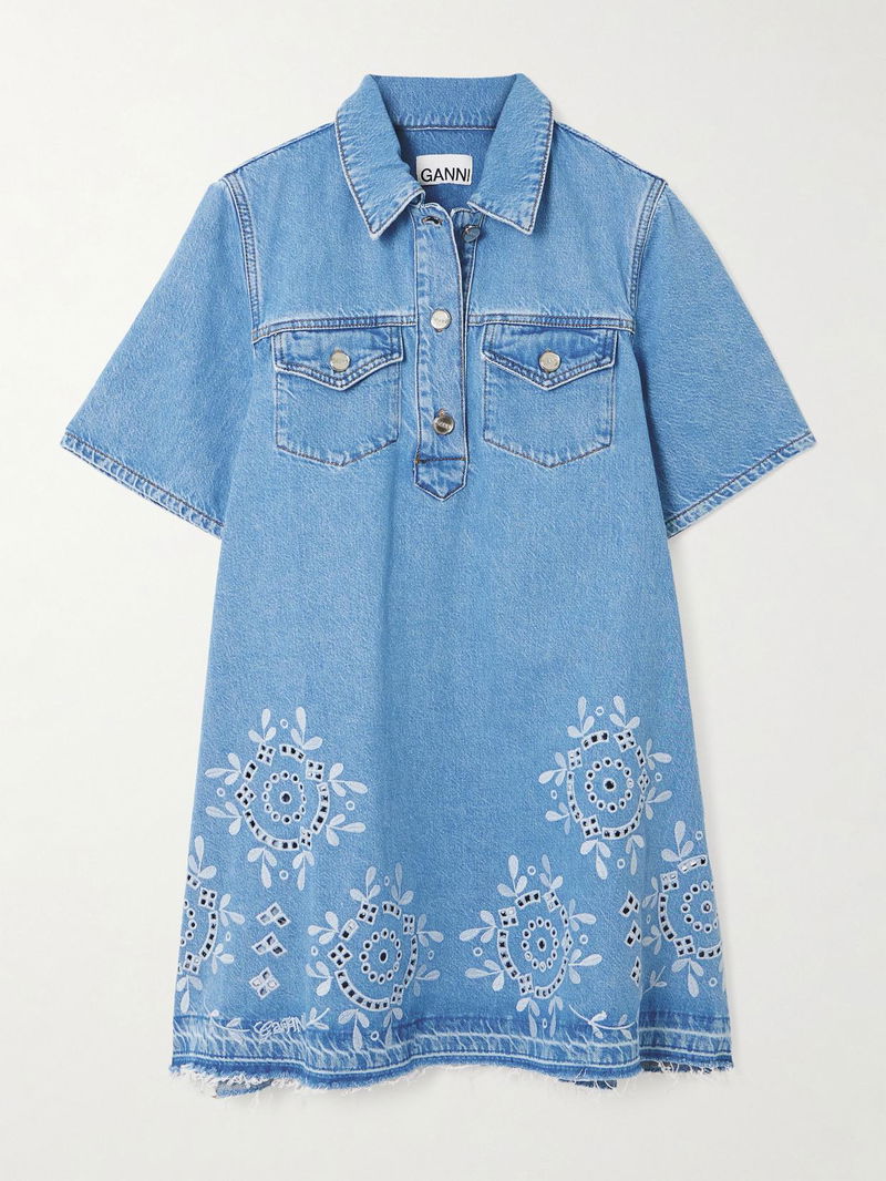 Combining denim and broderie anglaise, GANNI's dress is sweet but not too delicate. It has a shirt-style bodice with flap pockets and falls to a frayed mini hemline. Wear yours with mules or loafers.
