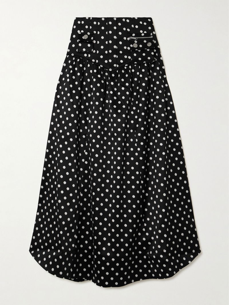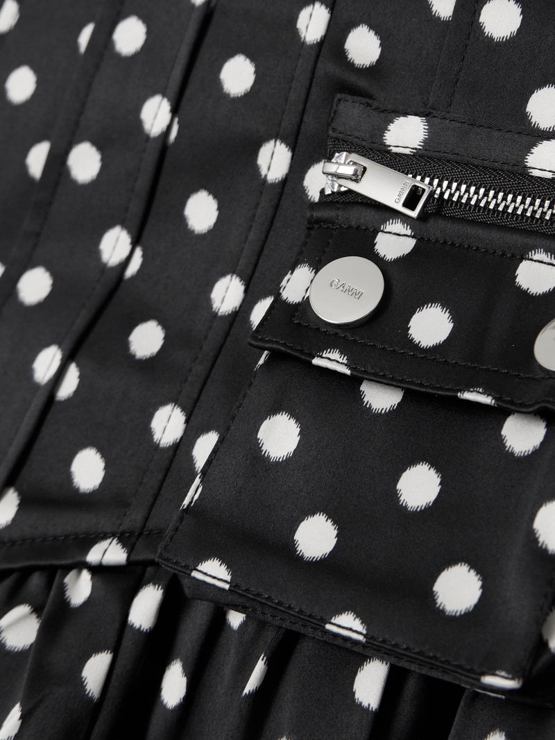 GANNI's skirt is detailed with pockets that add a utilitarian edge to the otherwise feminine style. It's cut from glossy polka-dot satin, made with recycled fibers, and has a paneled waist that complements the matching corset top – also in our edit.