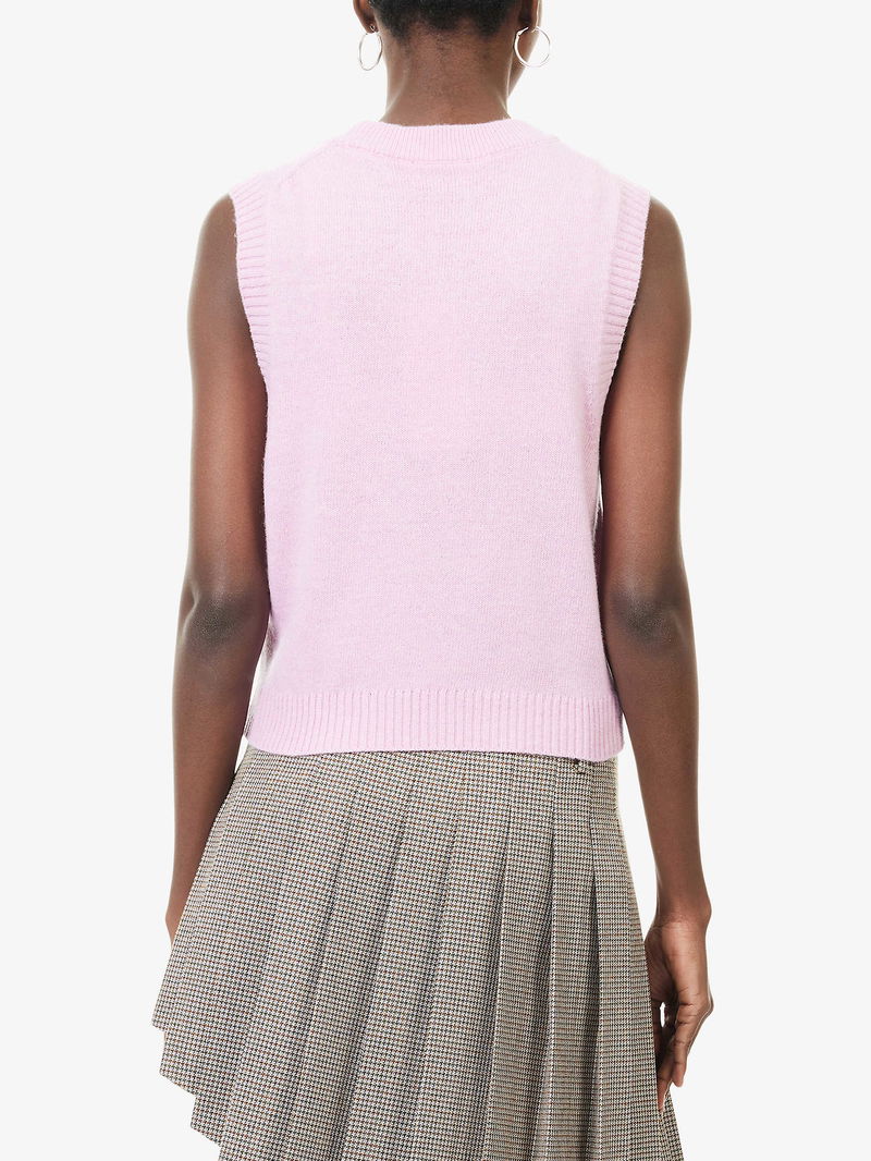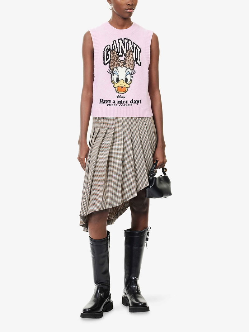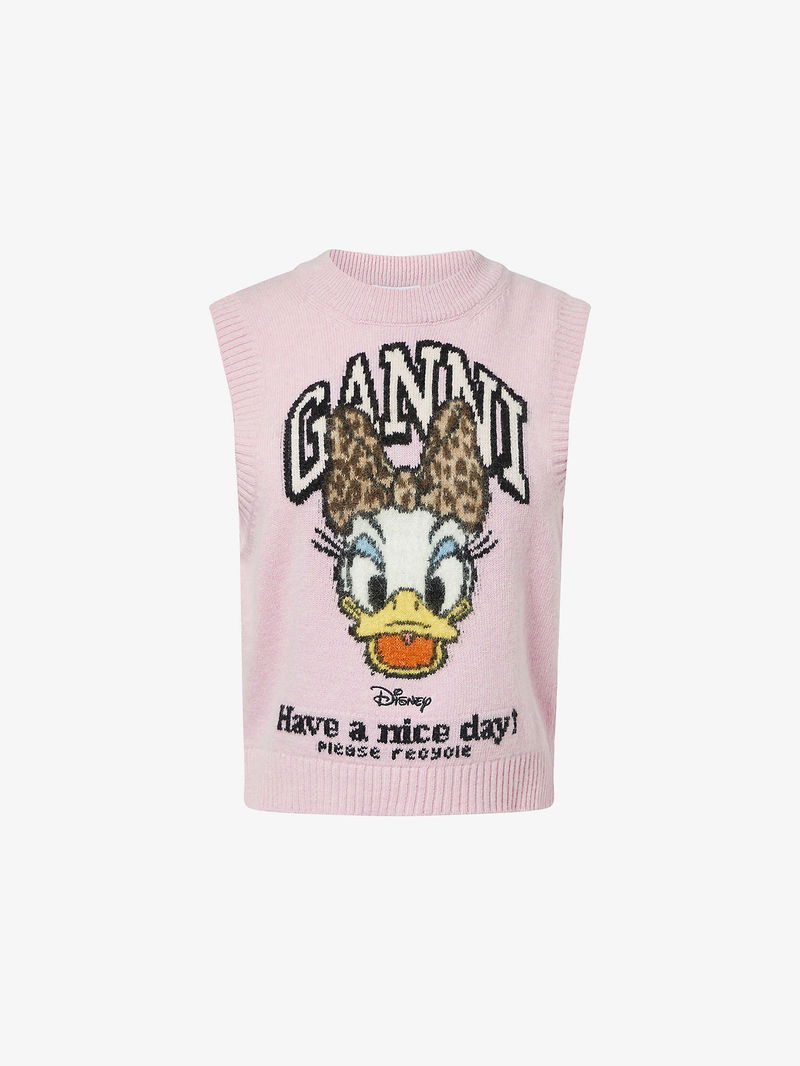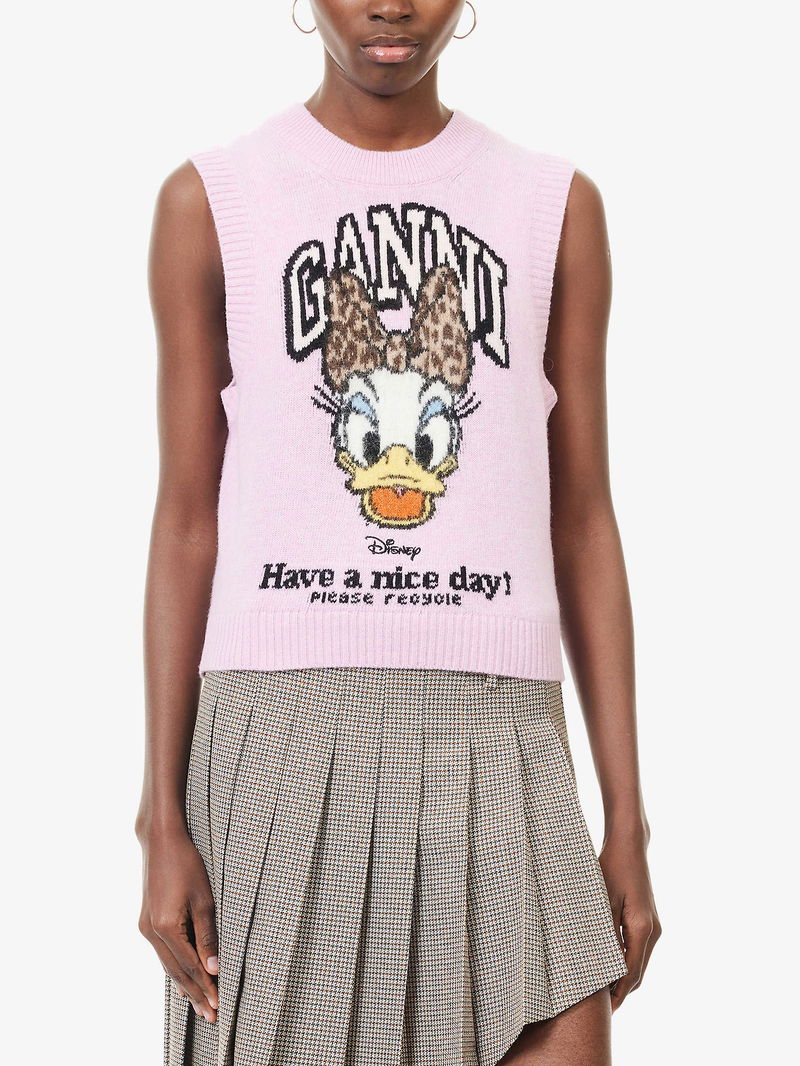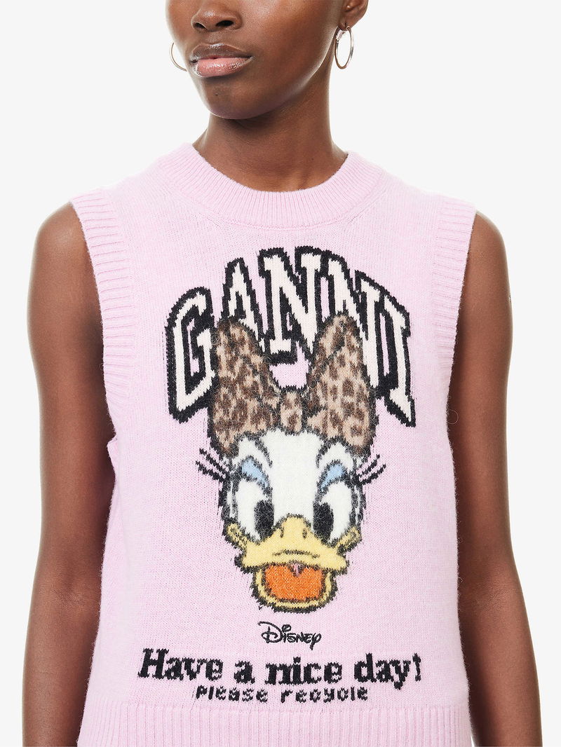 GANNI x Disney wool-blend vest. Slim fit, round-neck, sleeveless, brushed Daisy intarsia at front, brand and text print at front all-over knitted, ribbed trims.