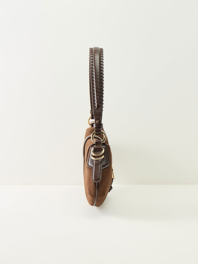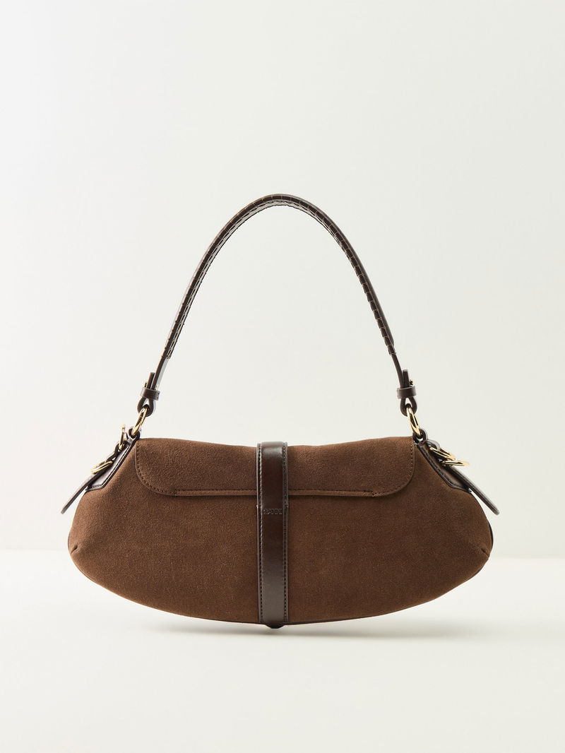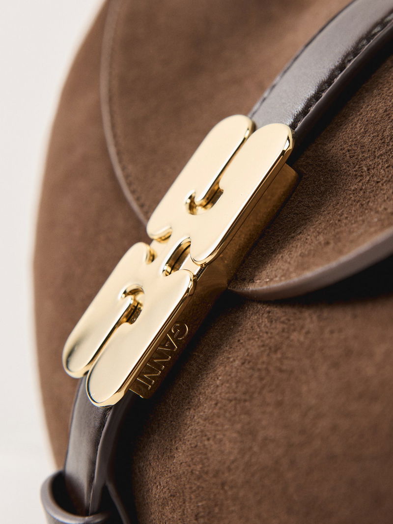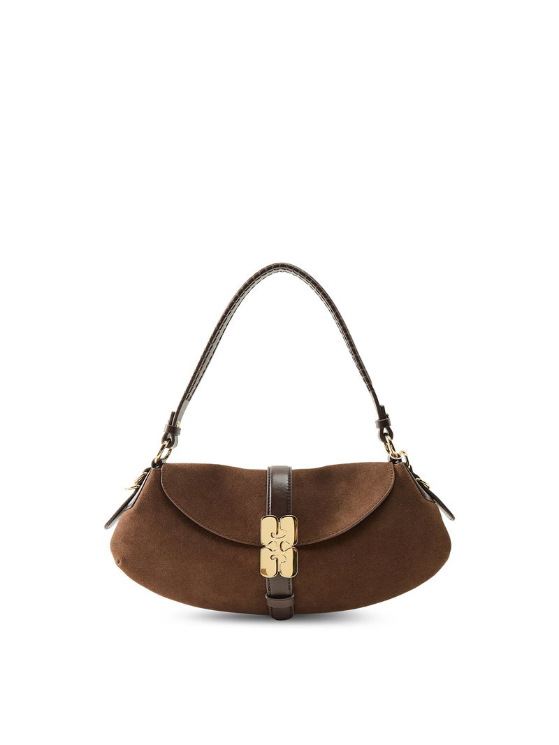 The Kat Baguette Suede Bag by Ganni delivers compact elegance with a contemporary silhouette. Finished in chicory coffee brown suede, it balances modern style with everyday wearability. A refined baguette bag with character.