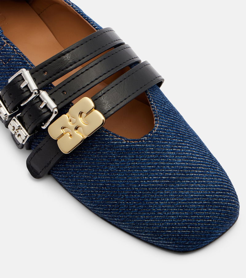 Copenhagen-based brand Ganni reshapes the meaning of Scandinavian style with its whimsy and playful approach to design. These ballet flats are crafted from a denim-inspired fabric and boast three straps on the uppers with signature logo hardware.