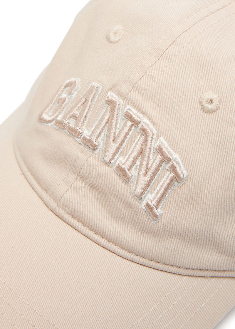 Ganni canvas cap. Embroidered logo at front, embroidered eyelets, concentric stitching at brim. Adjustable fastening at back.