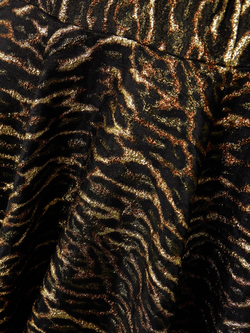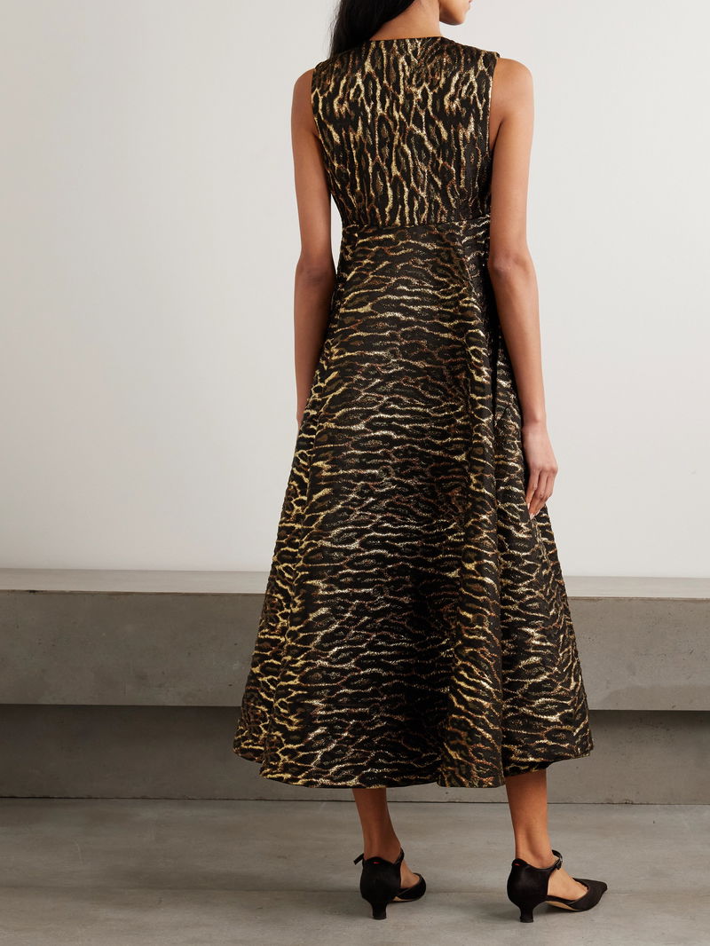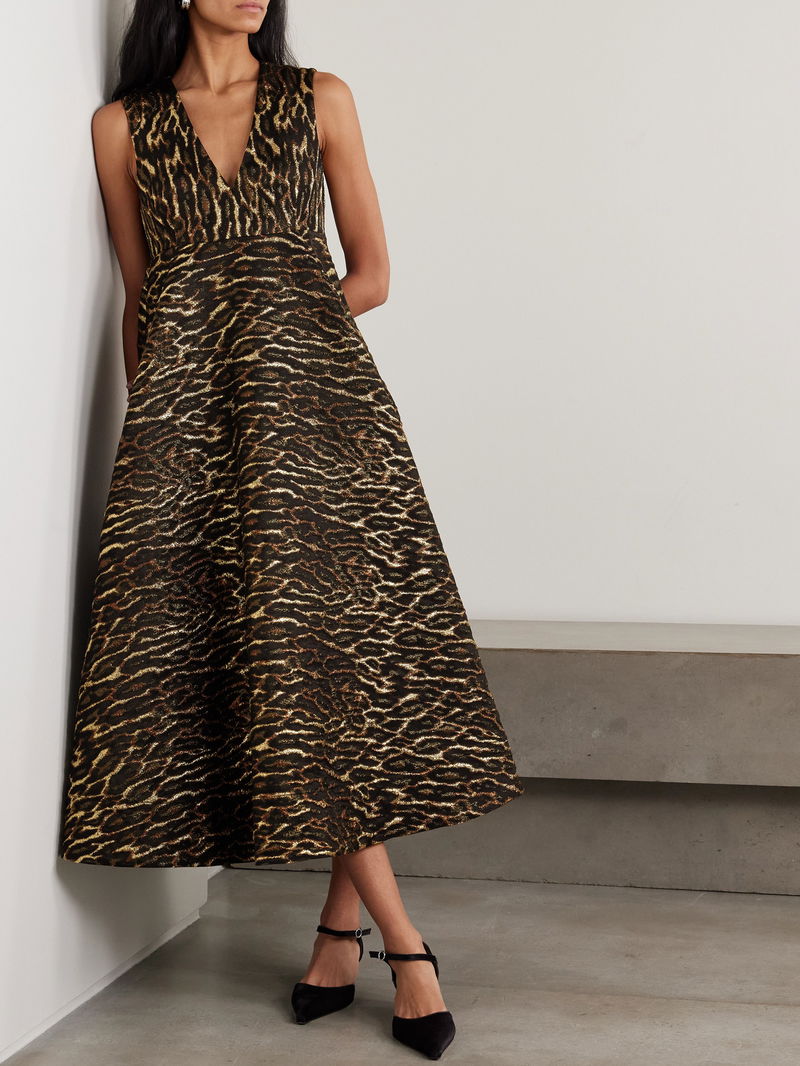 GANNI's midi dress is made from recycled-cloqué that's woven with a bold leopard pattern and flecked with sparkling metallic threads.