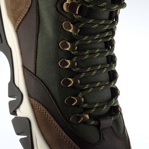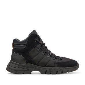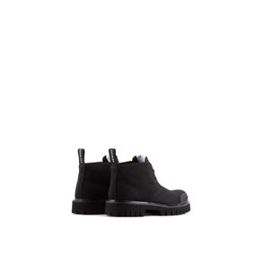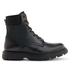 Calf-high stretch buffed recycled leather boots in black.· Square toe· Pin-buckle harness at ankle· Pull-loops at collar· Stretch buffed recycled leather lining· Stacked leather block heel and midsole· Rubber sole.