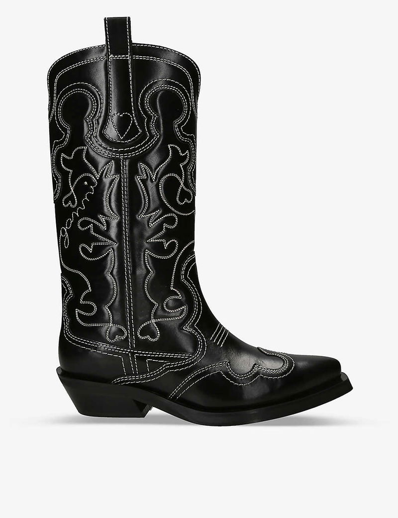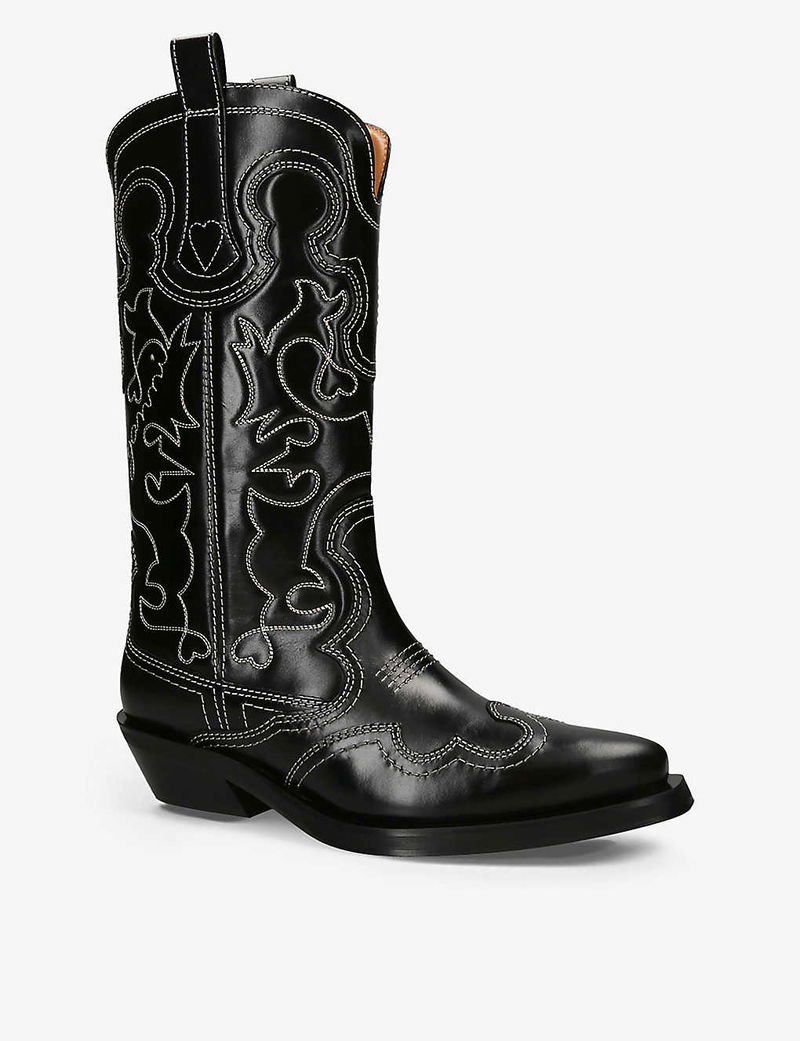 The Mid Shaft cowboy boots are a case in point, with their smooth leather construction and embroidered patterning. The pointed-toe pair is adorned with contrasting stitching and a slight block heel, keeping them authentic yet modern.