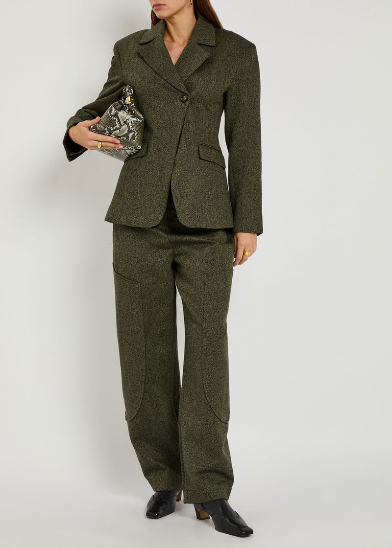 GANNI cotton-blend trousers. Belt loops, front slit pockets, faux slit pocket at back, designer plaque, fully lined. Concealed button, hook and zip fastening at front.