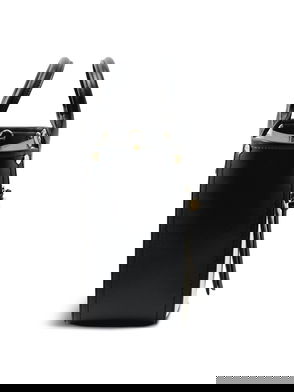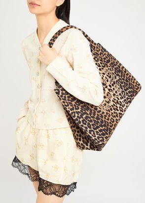 Large tote bag in organic cotton denim, finished with a tobacco contrast stitching, panels of different denim washes, and a GANNI LOVE smiley face graphic.