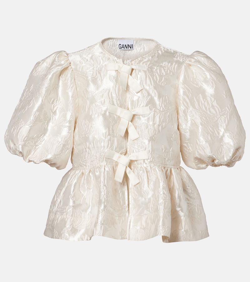 This blouse from Ganni showcases a lustrous satin construction, complemented by an all-over tonal jacquard pattern. The puff-sleeved design is cut to a peplum silhouette and secured by self-tie straps on the front.