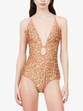 Ganni’s sultry leopard-print jersey swimsuit is crafted from recycled fibres which resonate with the label’s eco-conscious mantra. It’s shaped with slender shoulder straps which frame the plunging neckline and is centred with flattering ruching that’s accented with a crystal-encrusted bar. Pull focus to the dramatic neckline with a long pendant necklace.