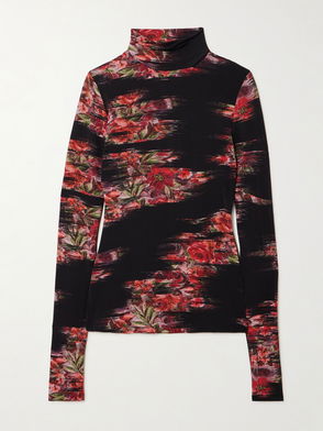 Semi-sheer stretch recycled nylon mesh turtleneck. · Graphic pattern printed throughout· Partially lined.