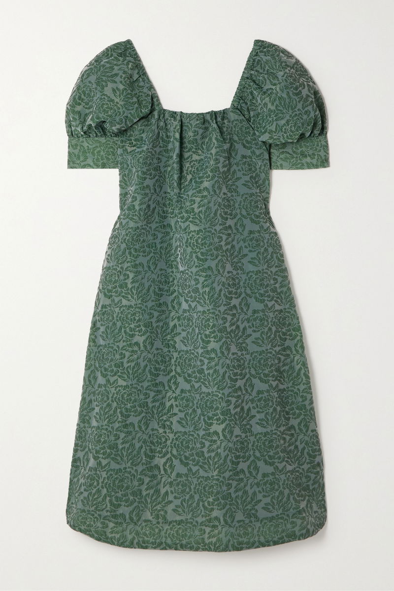 Inspired by busy Copenhagen lifestyles, GANNI creates seriously cool dresses that work for a host of different occasions. This midi style is made from jacquard blended with recycled fibers and has signature puffed sleeves. Wear it with sandals or sneakers.