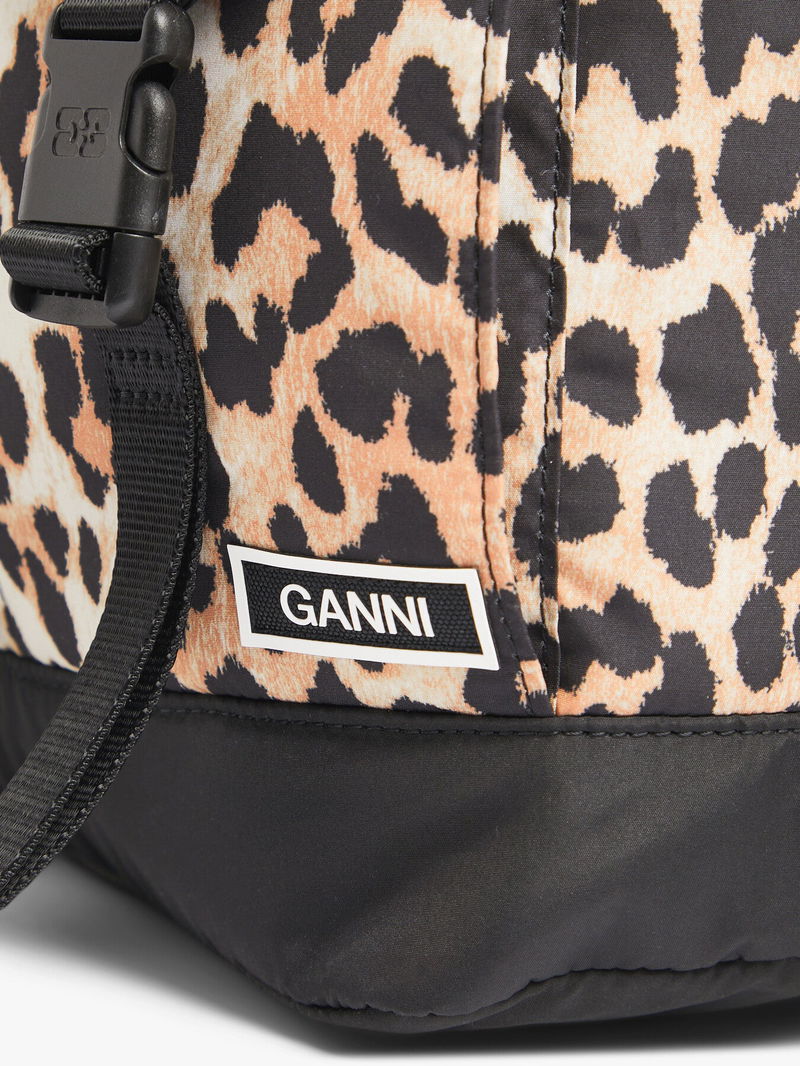 This Leopard Tech Backpack is made from certified recycled polyester. The backpack features adjustable and padded shoulder straps, a top handle, front buckle fastenings, front pockets, a foldover top, GANNI logo and a leopard print.