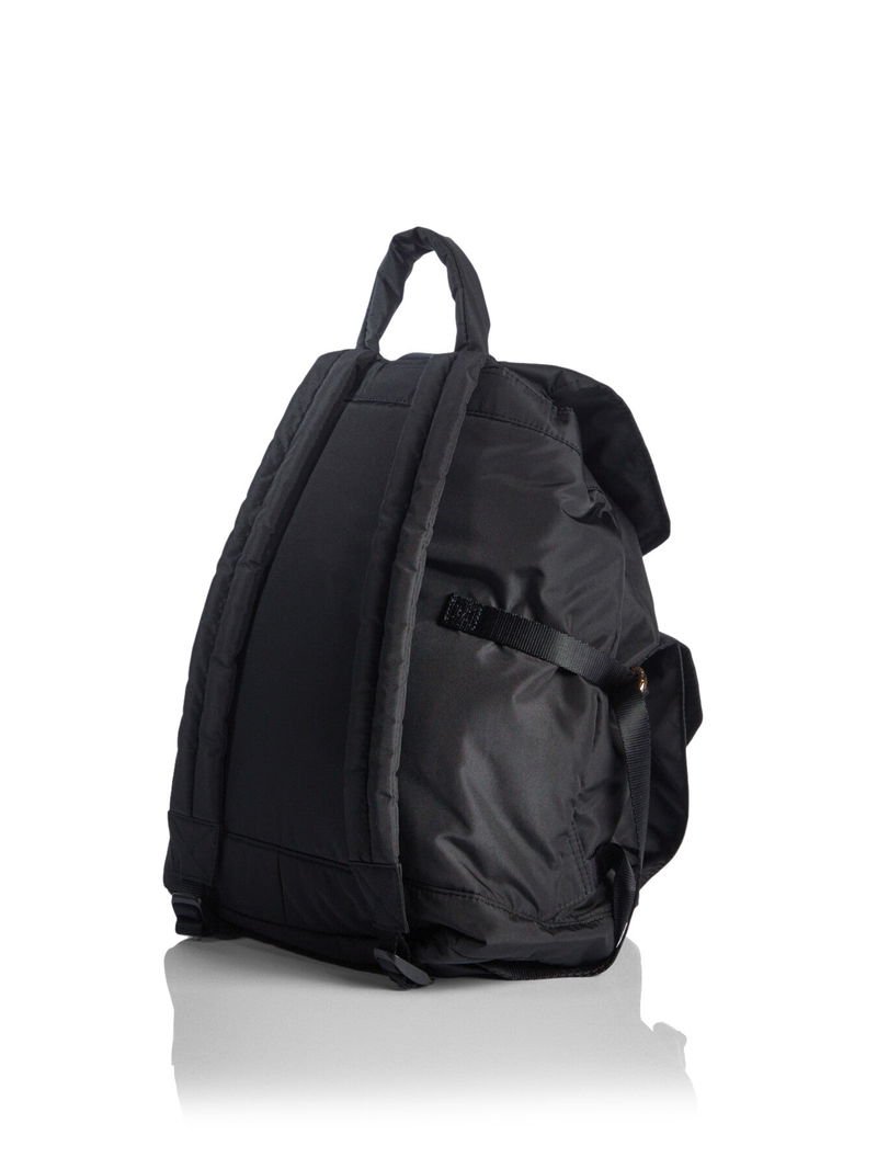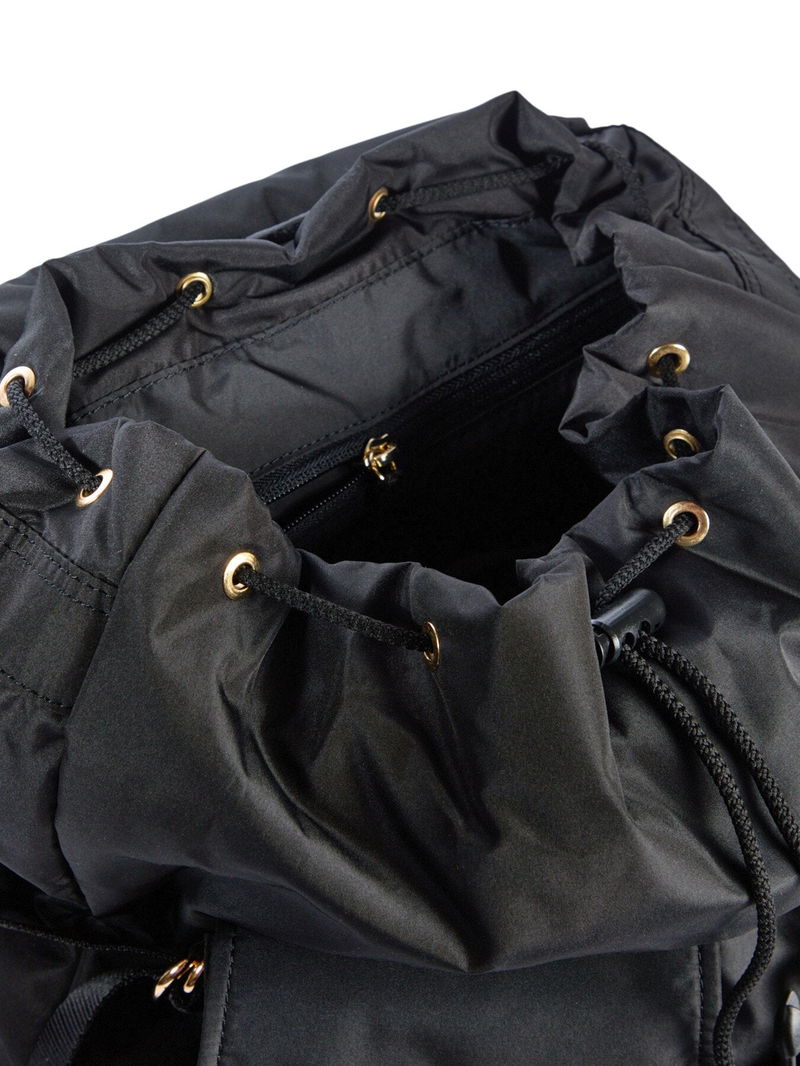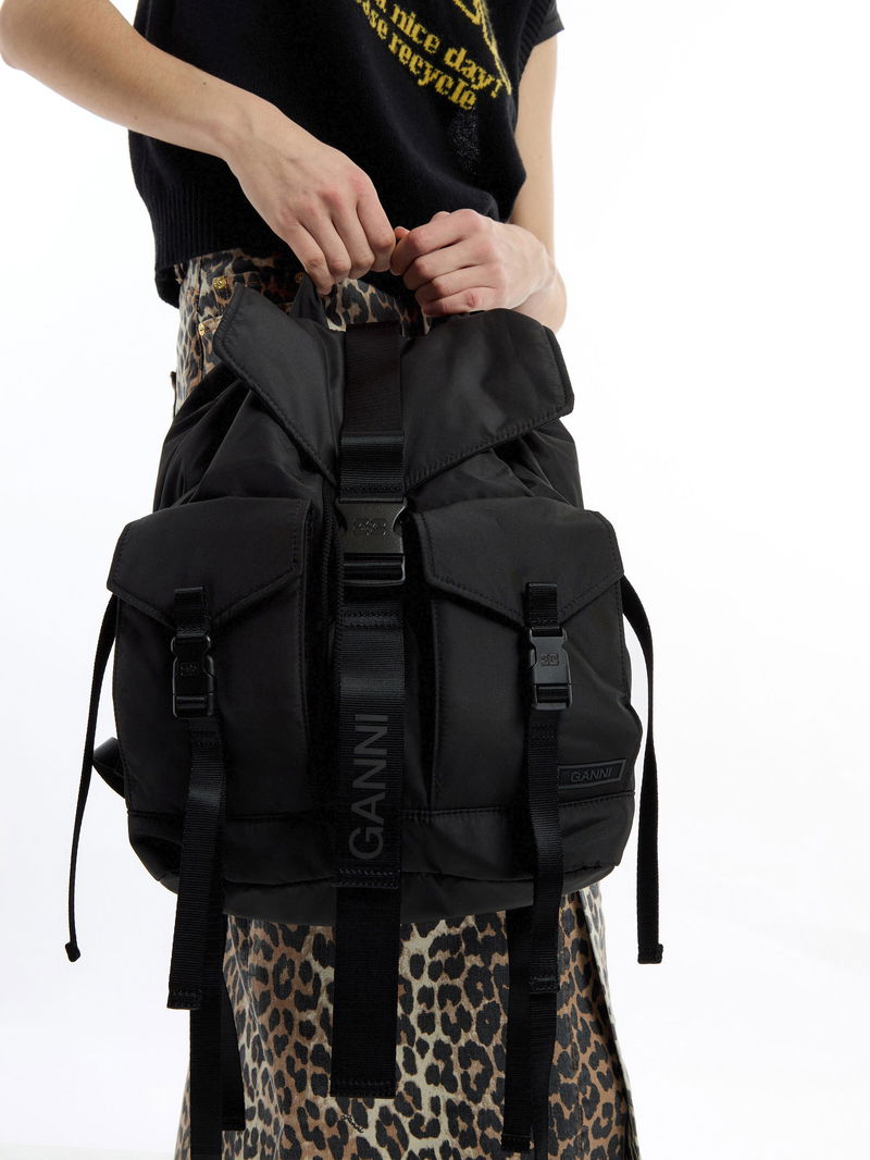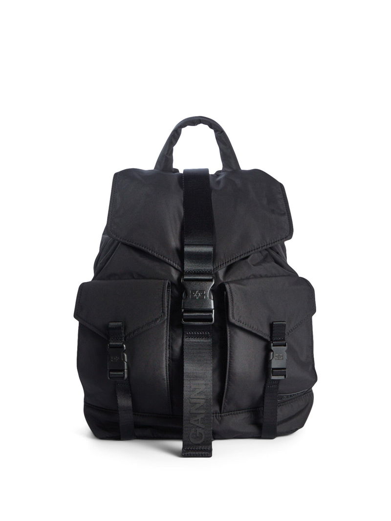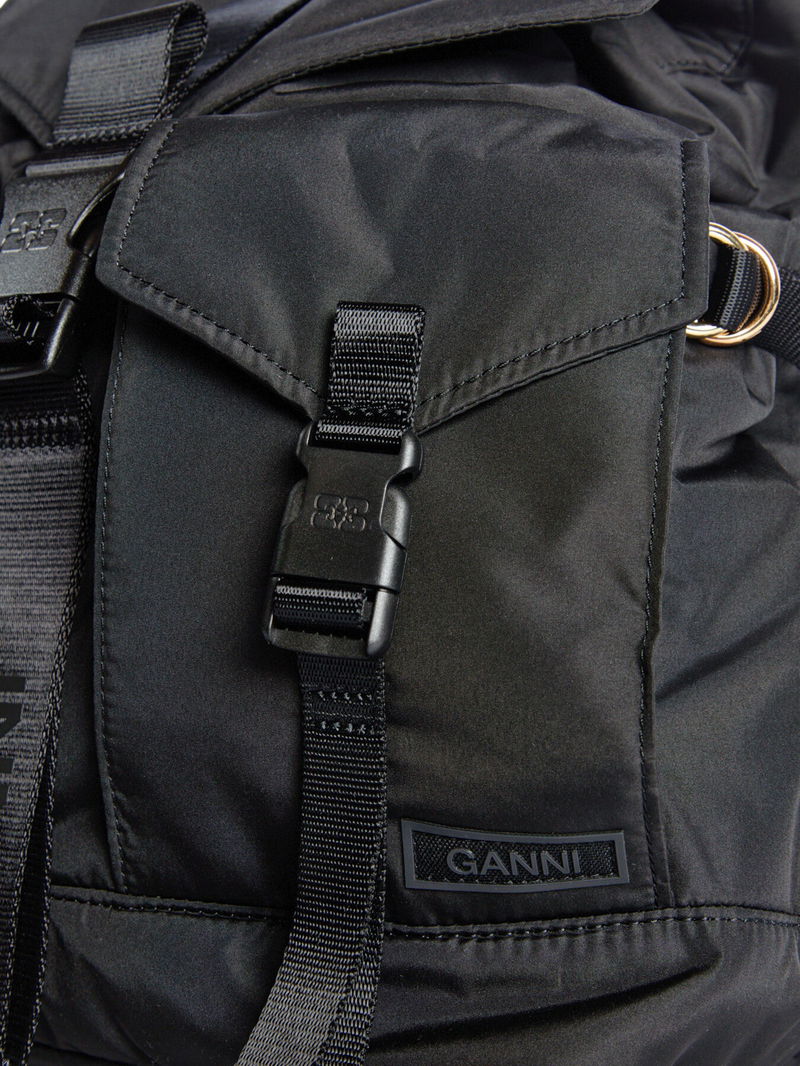 The backpack incorporates adjustable and padded shoulder straps, a top handle, front buckle fastenings, front pockets, a foldover top and GANNI log.