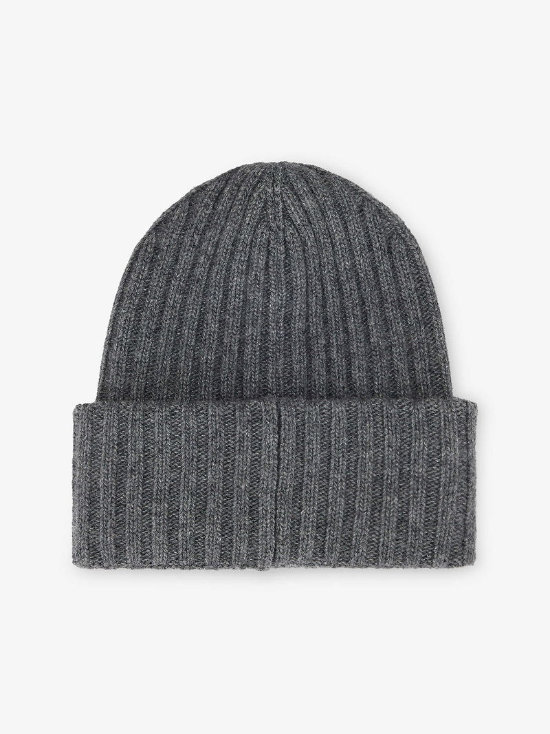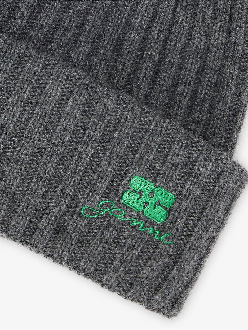 GANNI wool-blend beanie. Folded brim, brand embroidery at front, all-over knitted and ribbed.