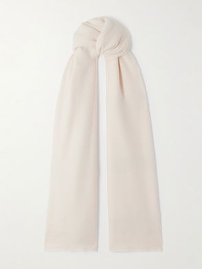 Look to Ganni for elegantly simple cold-weather staples such as this beige wool-blend scarf. It's neatly rib-knitted from a wool blend to a rectangular silhouette and generous length, then subtly hallmarked with a monochrome label appliqué at the corner. Retain the soft palette through cold climes by styling it with muted edits.