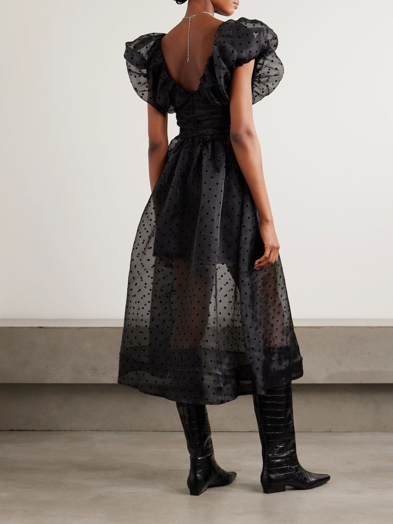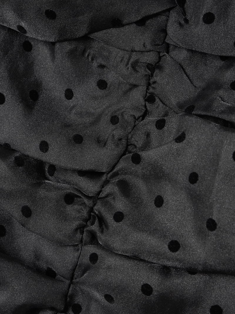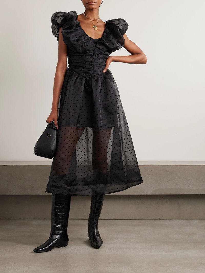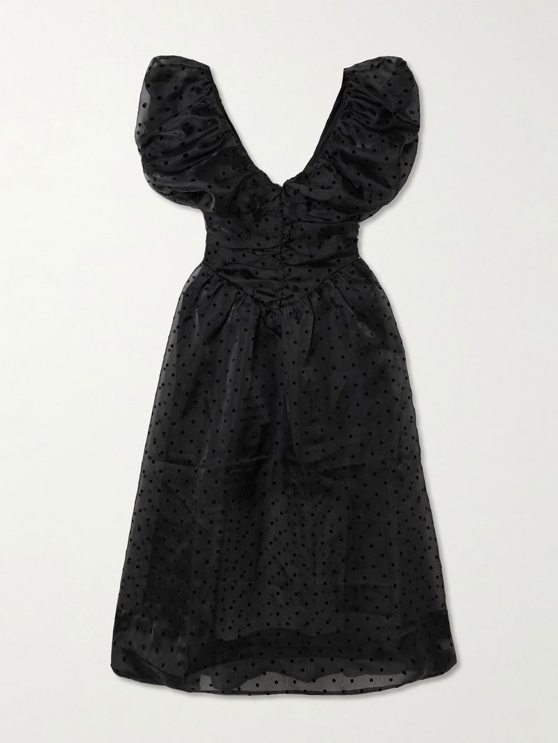 A playful choice for parties, GANNI's dress has a ruched bodice and puffed sleeves. It's cut from recycled organza with flocked polka-dots, giving it an '80s feel. The built-in slip provides ample coverage.