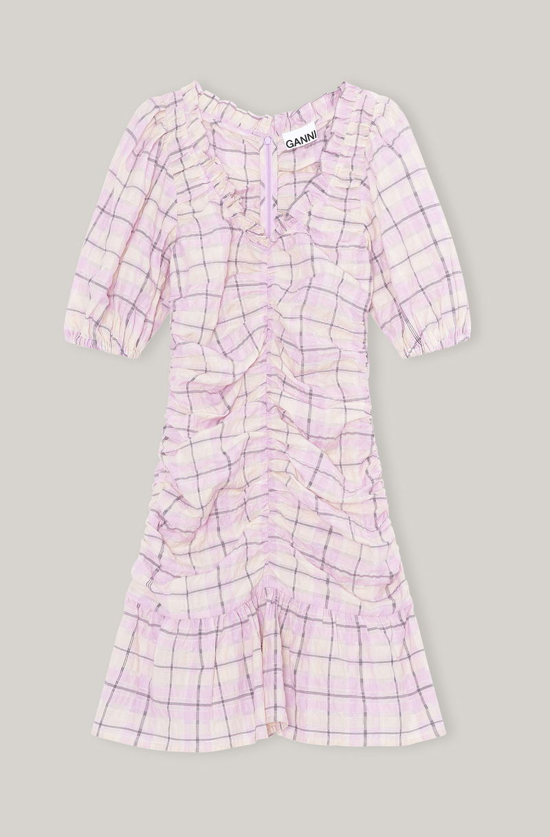 Ruched mini dress in checkered seersucker in a recycled blend, featuring a ruffled v-neckline, ruffled flouncey hem, and short puff sleeves. RESPONSIBLE BLEND This piece is made of 37% recycled polyester and 57% organic cotton, which significantly lowers the environmental footprint of a garment. Using recycled fibers decreases the demand for virgin fibers, and organic cotton reduces water usage, greenhouse gas emissions, and the amount of chemicals used.