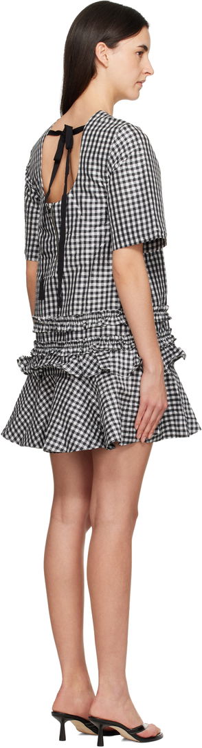 Semi-sheer recycled polyester seersucker minidress. Check pattern throughout. · Ruffled stand collar with self-tie fastening· Smocking at bodice· Puff sleeves· Low back · Fully lined.