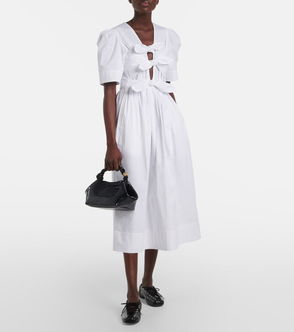 Organic cotton poplin dress. Gathering throughout. · Square neck· Shirring at front · Ruffled trim at hem· Elasticized shoulder straps· Elasticized straps and cutouts at back.
