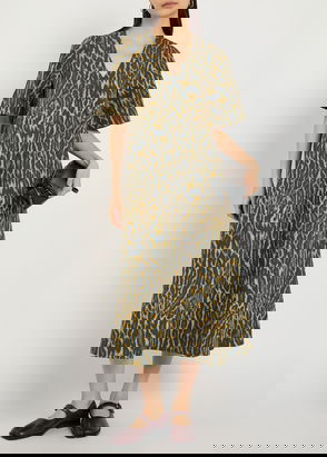 Form-fitting through hips with a straight skirt Round neck Side slits Subtly gathered, long sleeves with buttoned cuffs Lightweight, fluid, silk satin fabric with slight stretch Seasonal FW20 GANNI print speckled with logo.