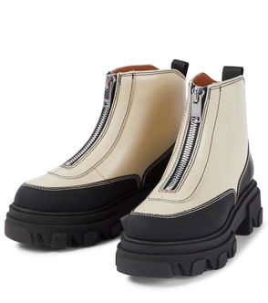 Ankle-high recycled polyester canvas boots in tones of beige. Graphic pattern printed in black throughout. · Pointed toe· Pin-buckle strap at vamp and collar· Cutout at sides· Zip closure at heel· Leather lining· Block heel with rubber injection· Tunit sole.