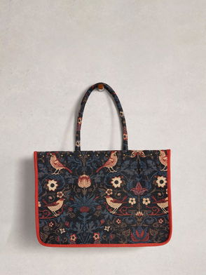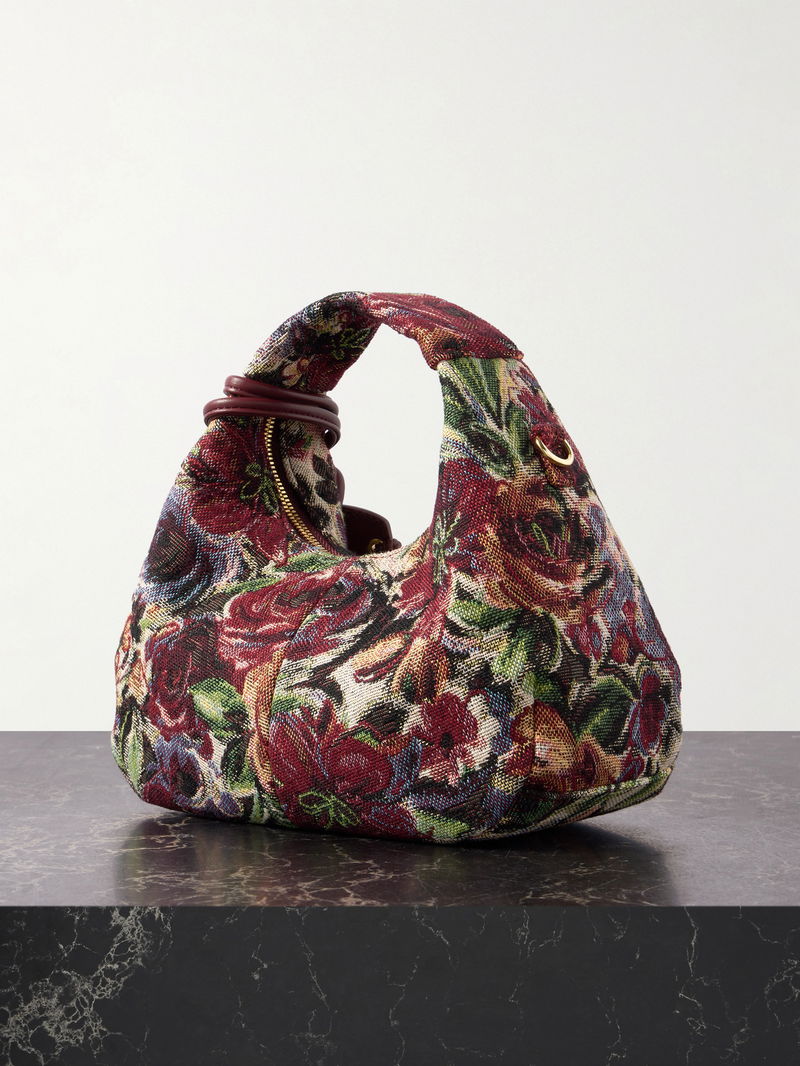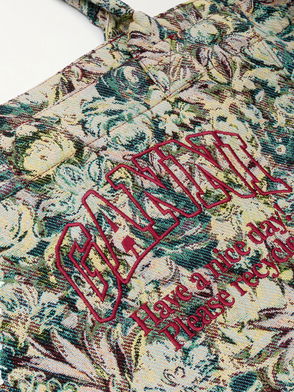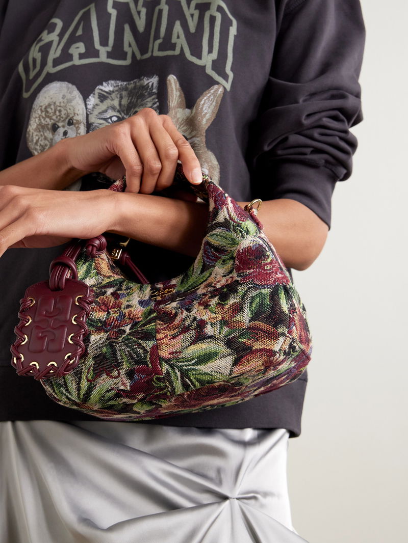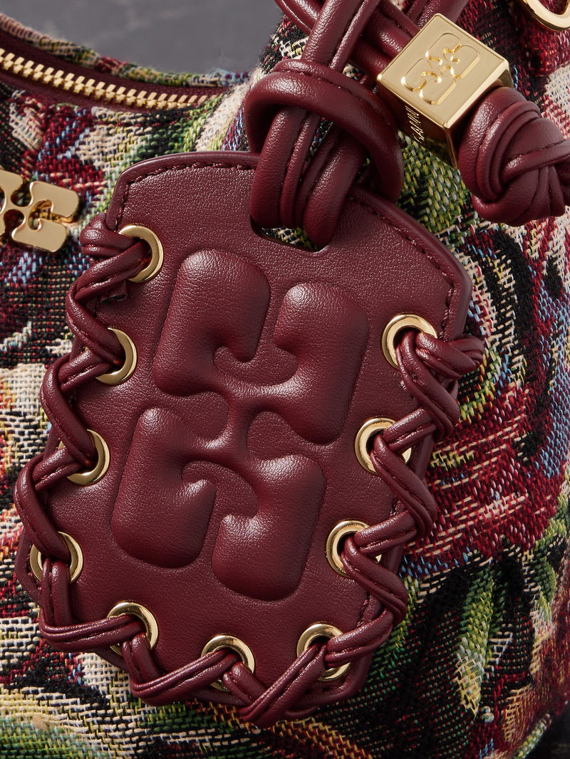 GANNI's tote is made from floral jacquard, inspired by vintage tapestry. It has leather trims and a branded luggage tag looped through the top handle. The inside fits your phone, tin of mints and house keys.