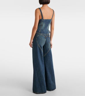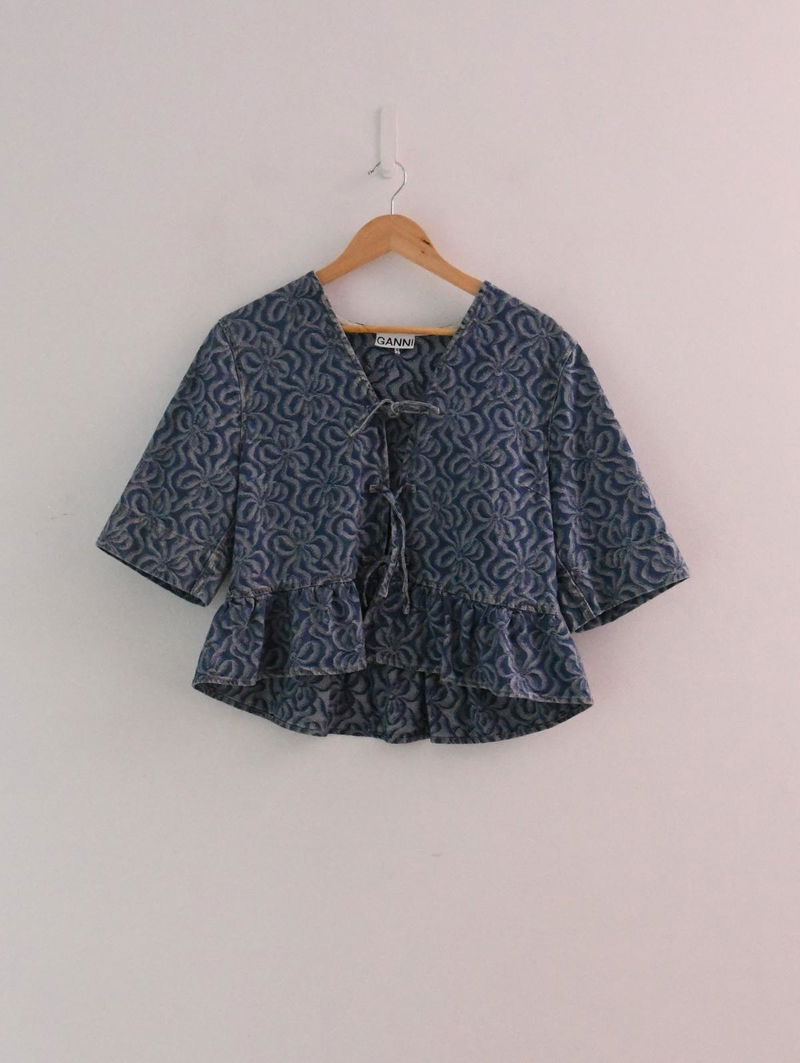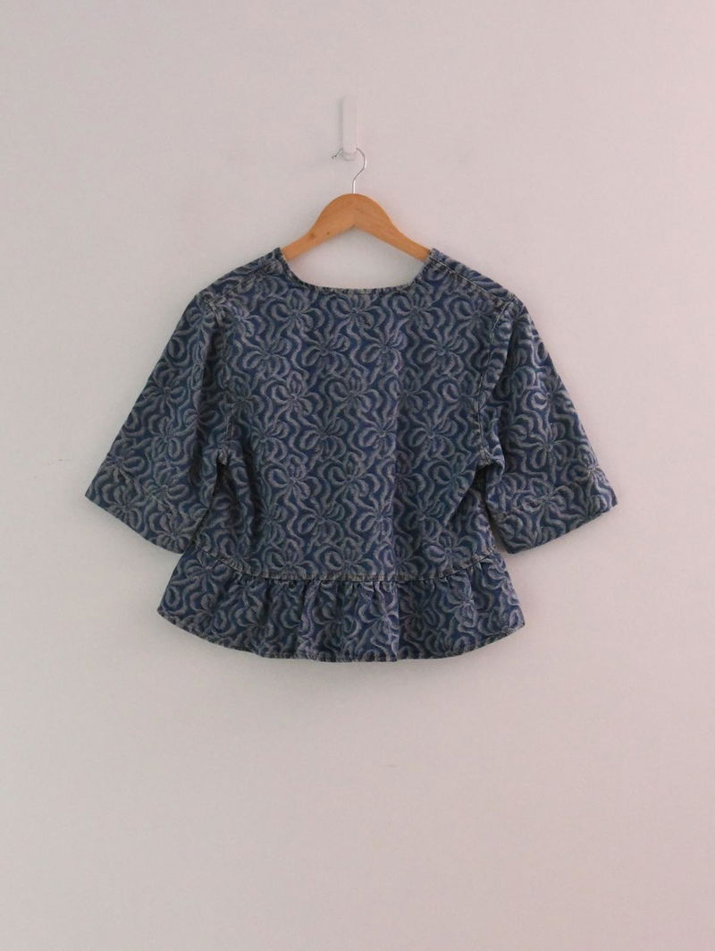 Top, Denim, Jacquard, Peplum, Ties at front, Mid-weight, non-stretchy fabric.