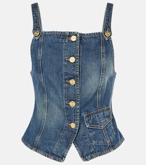 Stretch organic cotton denim top. Fading throughout.· Paneled construction· Straight neck· Button closure· Frayed edge at hem · Logo patch at back· Logo-engraved gold-tone hardware.