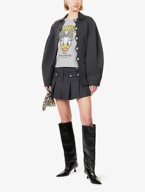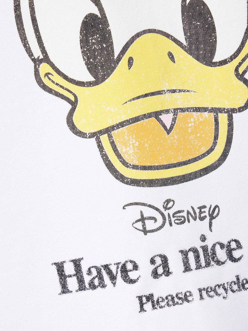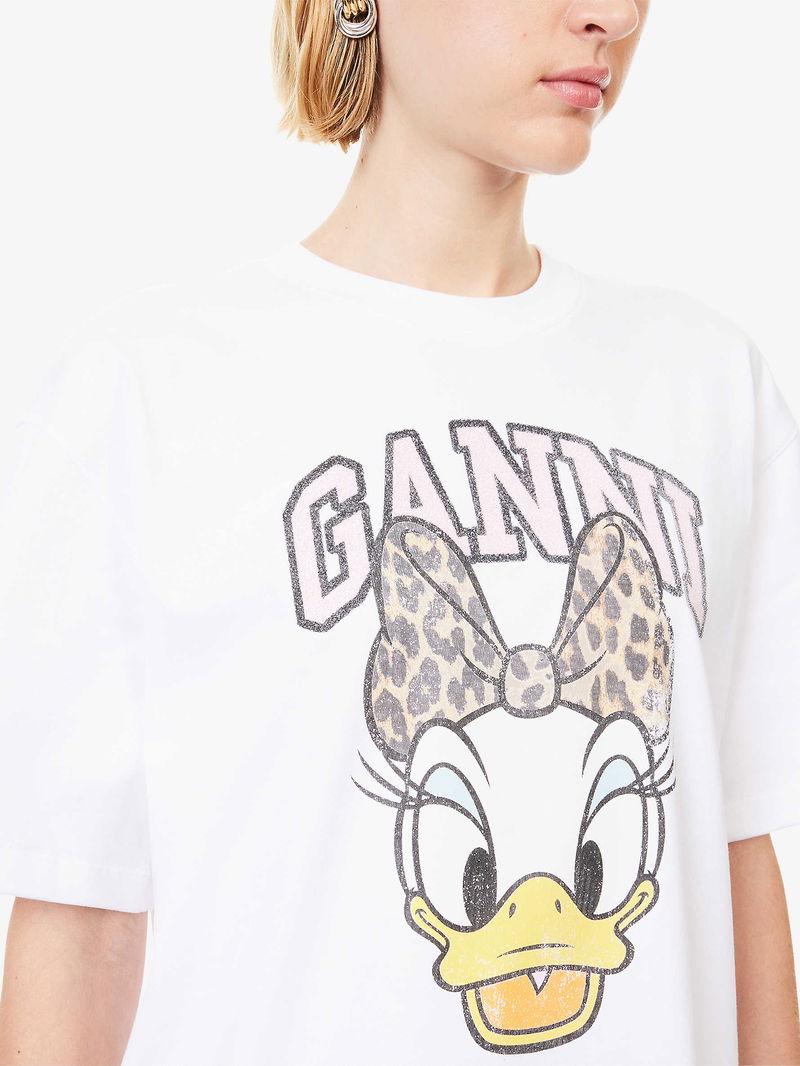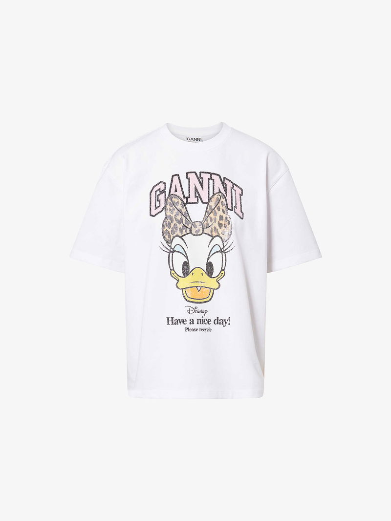 GANNI x Disney cotton-jersey T-shirt. Relaxed fit, ribbed round-neck, short sleeves, glitter branding and Daisy Duck print at front.