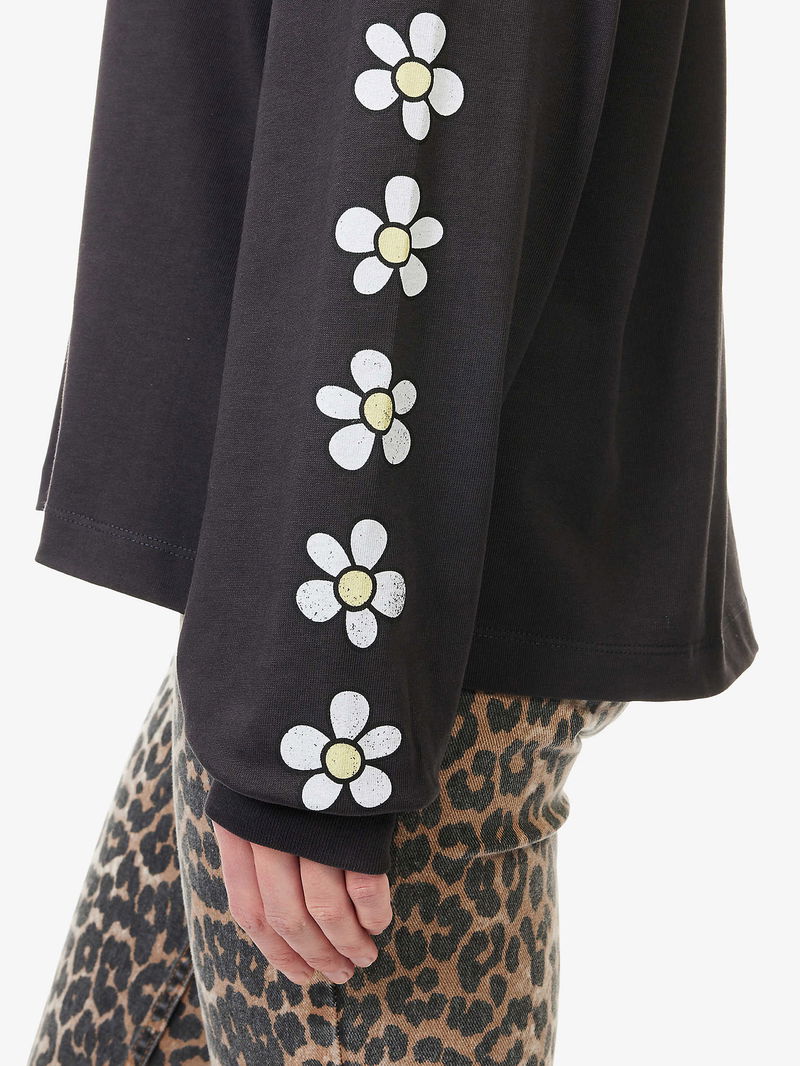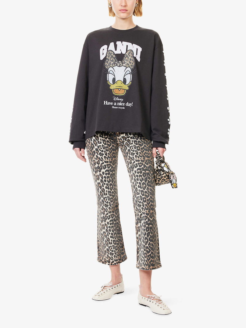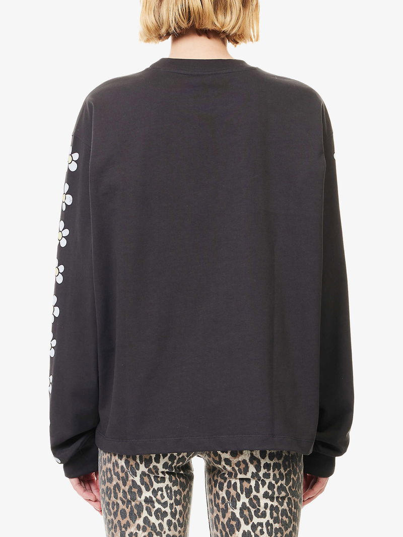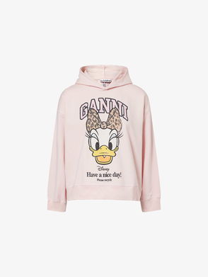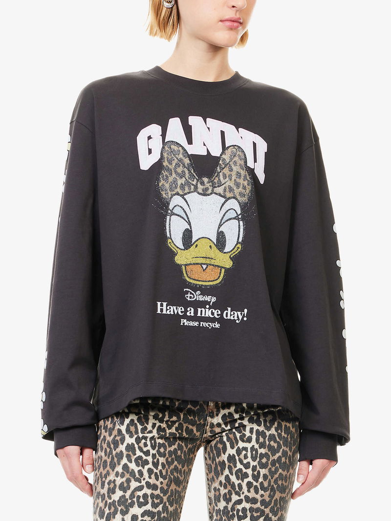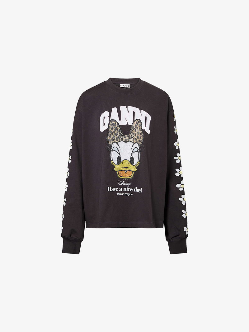 GANNI x Disney cotton-jersey sweatshirt. Relaxed fit, round-neck, flower print at long sleeves, brand and Daisy Duck print at front, ribbed trims.