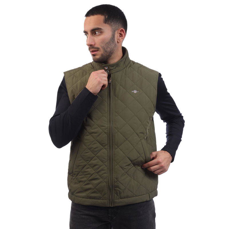 Mens Gant Quilted Windcheater Vest in juniper green. Crafted in a diamond quilting structure this Quilted Windcheater Vest features recycled polyester padding and is treated with a water-repellent finish. Design details include a one-way zipper at the front snap buttons at the collar slanted welt side pockets and an elasticated hem and cuff with a press button adjuster. This windcheater vest features a Durable Water Repellent (DWR) treatment which will help to shed water in light weather conditions.