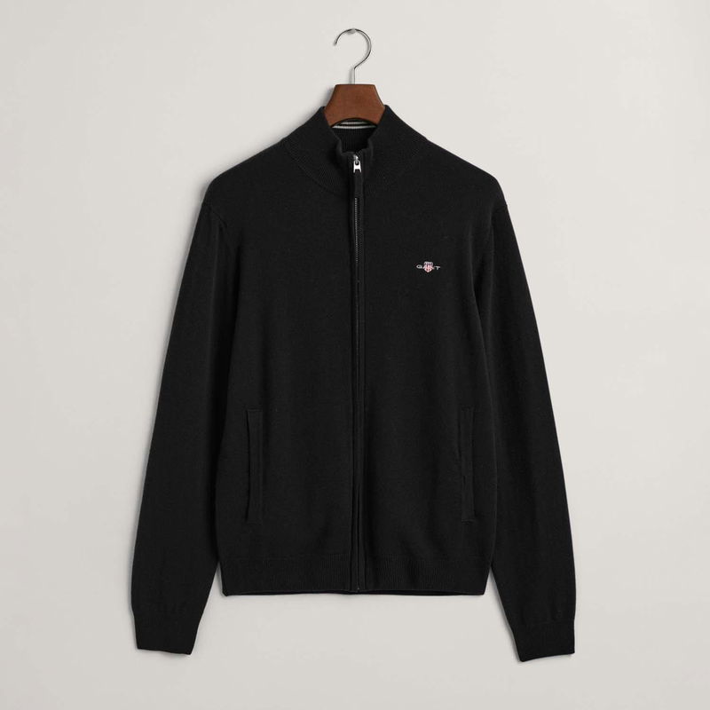 Crafted from 100% superfine lambswool this GANT cardigan is a great addition to any wardrobe. Designed for a regular fit it features front zip closure side pockets ribbed detailing at the neck hem and cuffs and a small-scale shield graphic embroidered on the chest.