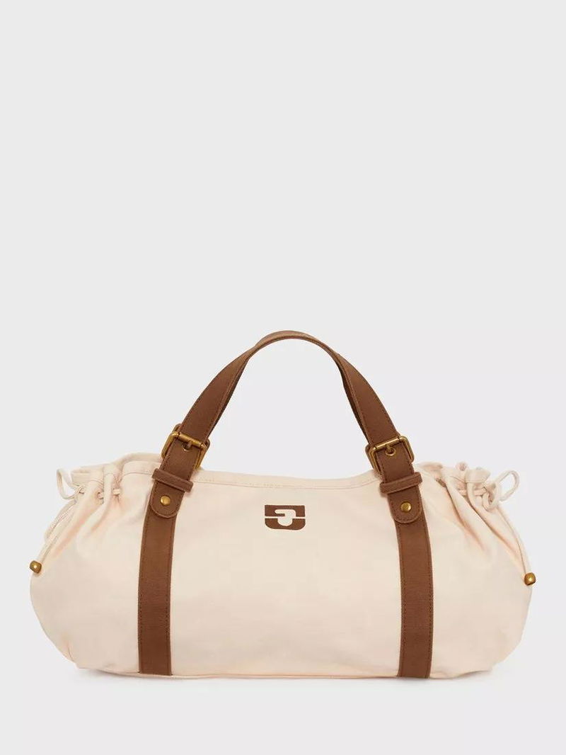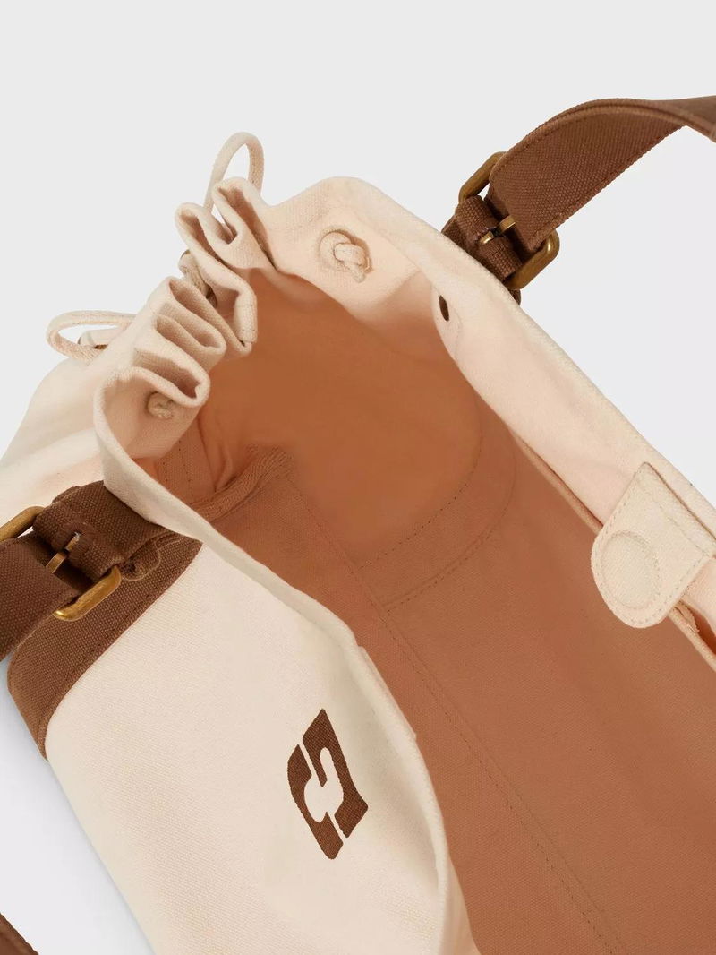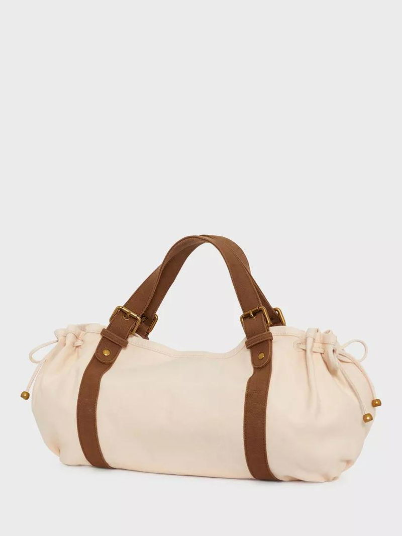 Accented with a contrast strap, this grab bag from Gerard Darel comes in durable cotton and secures with a drawstring top.