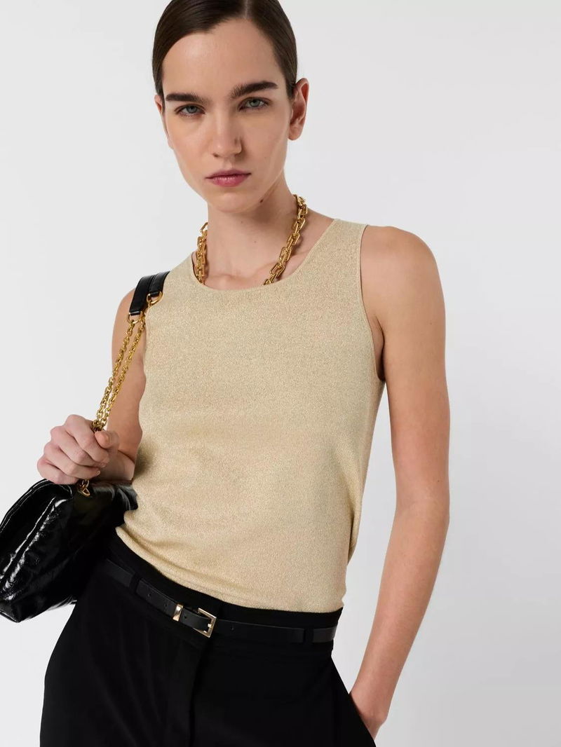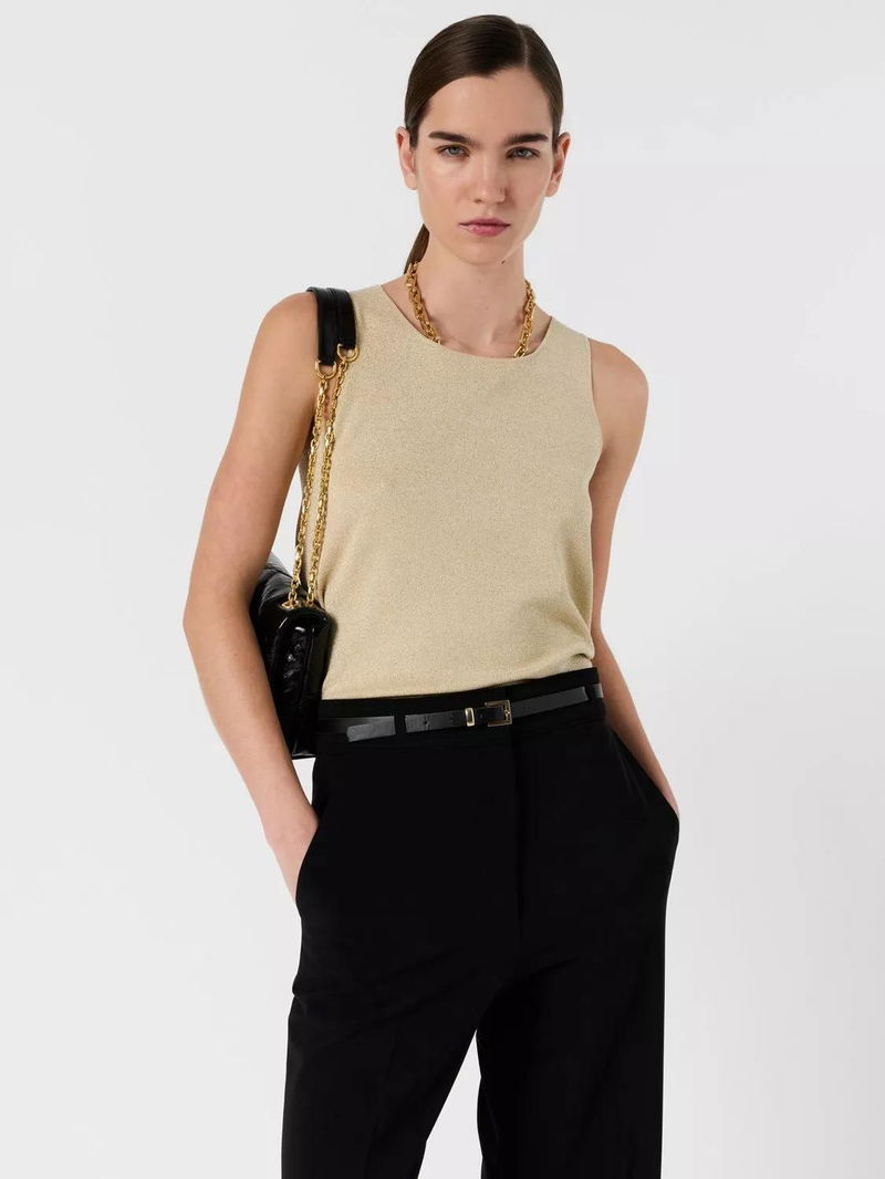 A fine-knit, sleeveless jumper from Gerard Darel. Metallic threads add sparkle while the round neck keeps things classic, perfect for layering or standing out on its own.