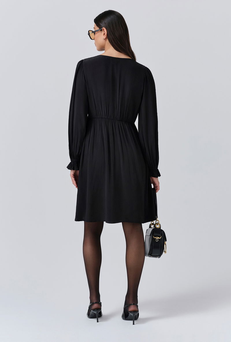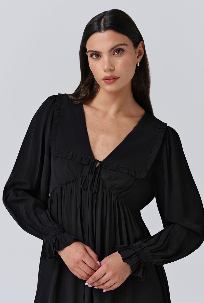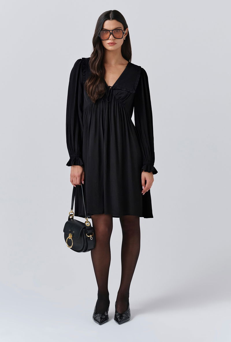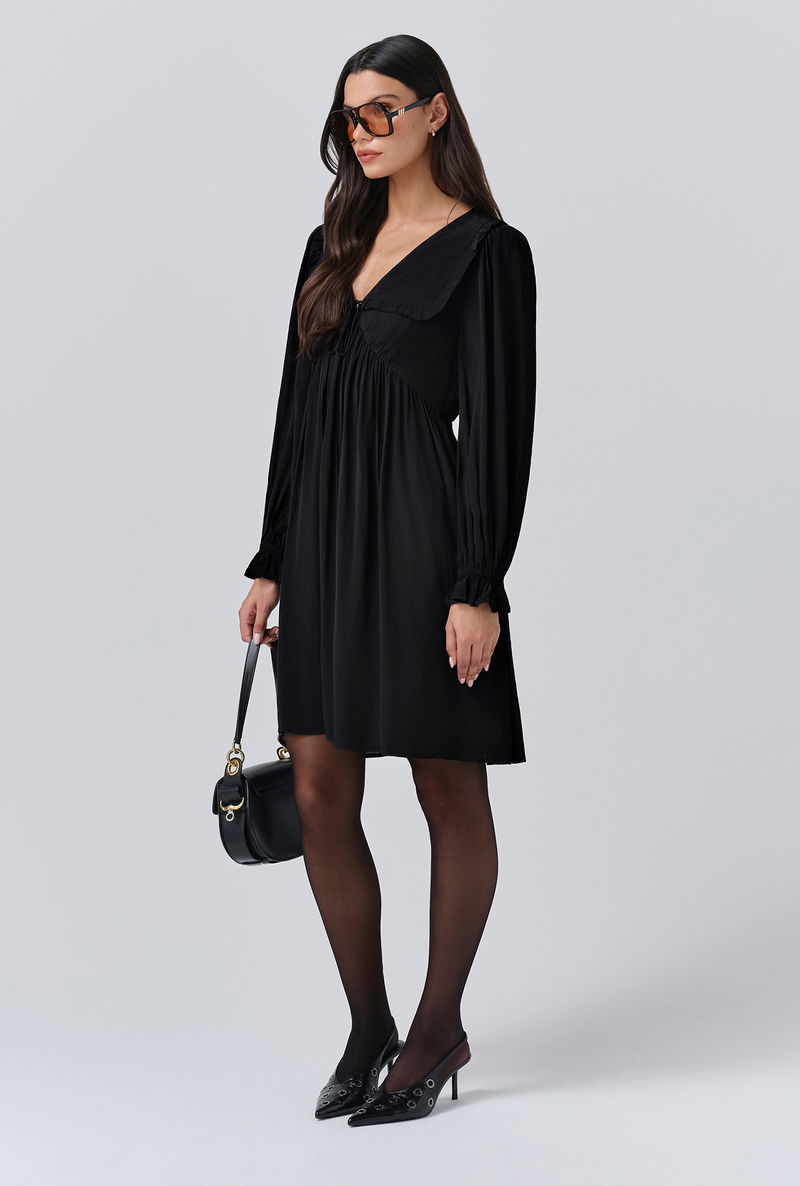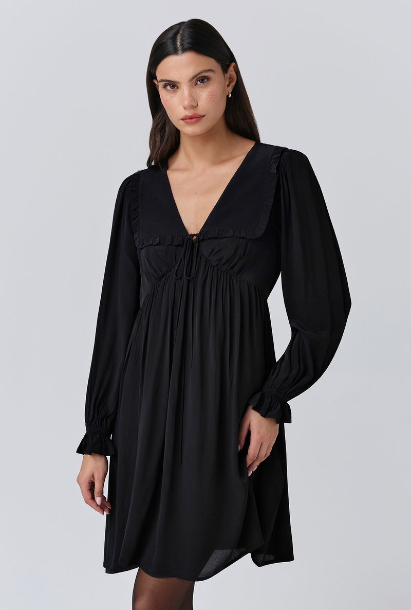 A pop of black is an effortless way to make an impact, that’s why we created Bianca, a mini dress that’s as bold as it is beautiful. Featuring a statement collar, long sleeves with a frilled cuff and a flattering empire line cut, it’s crafted from lightweight crepe fabric to ensure maximum ease of wear, whatever the occasion.