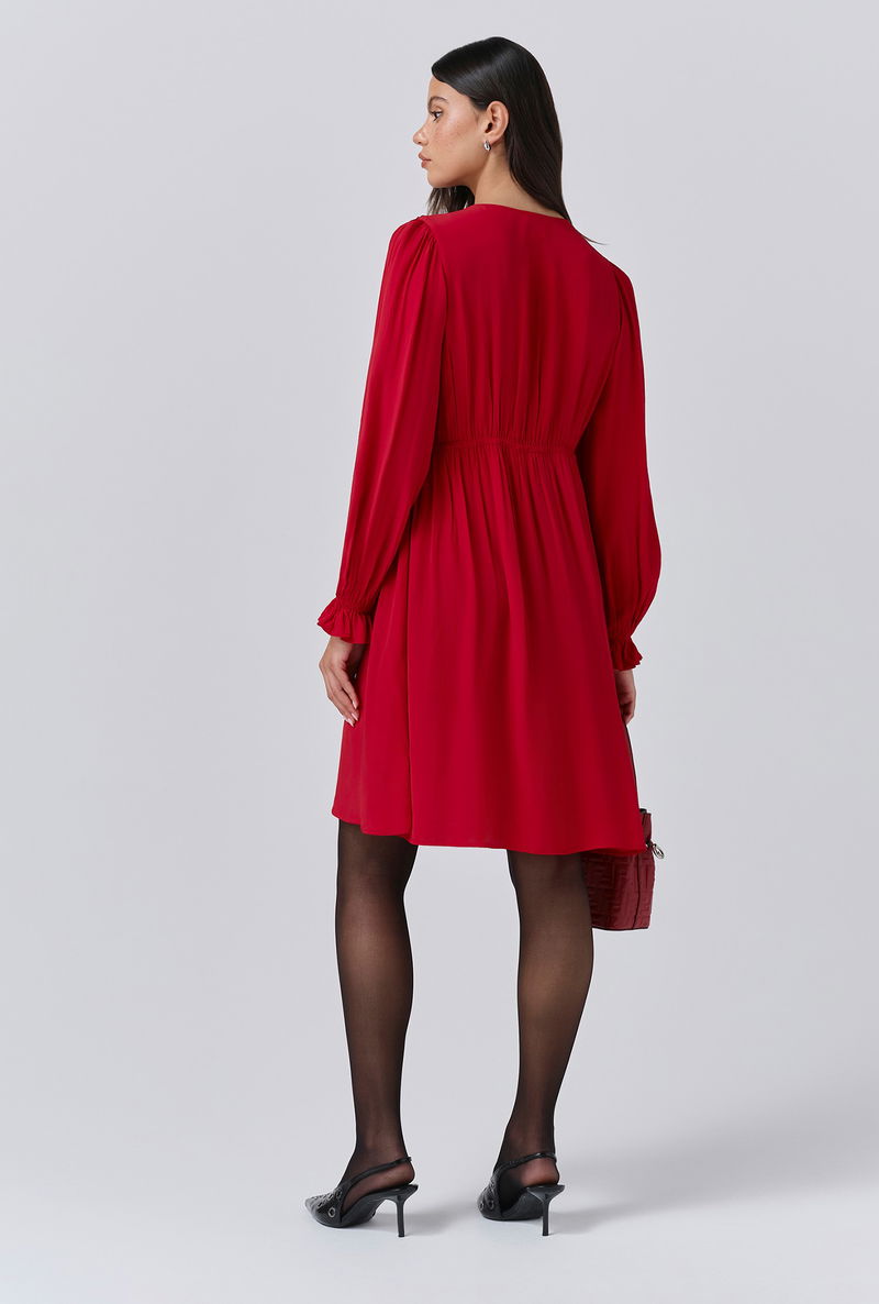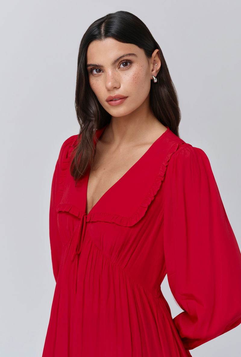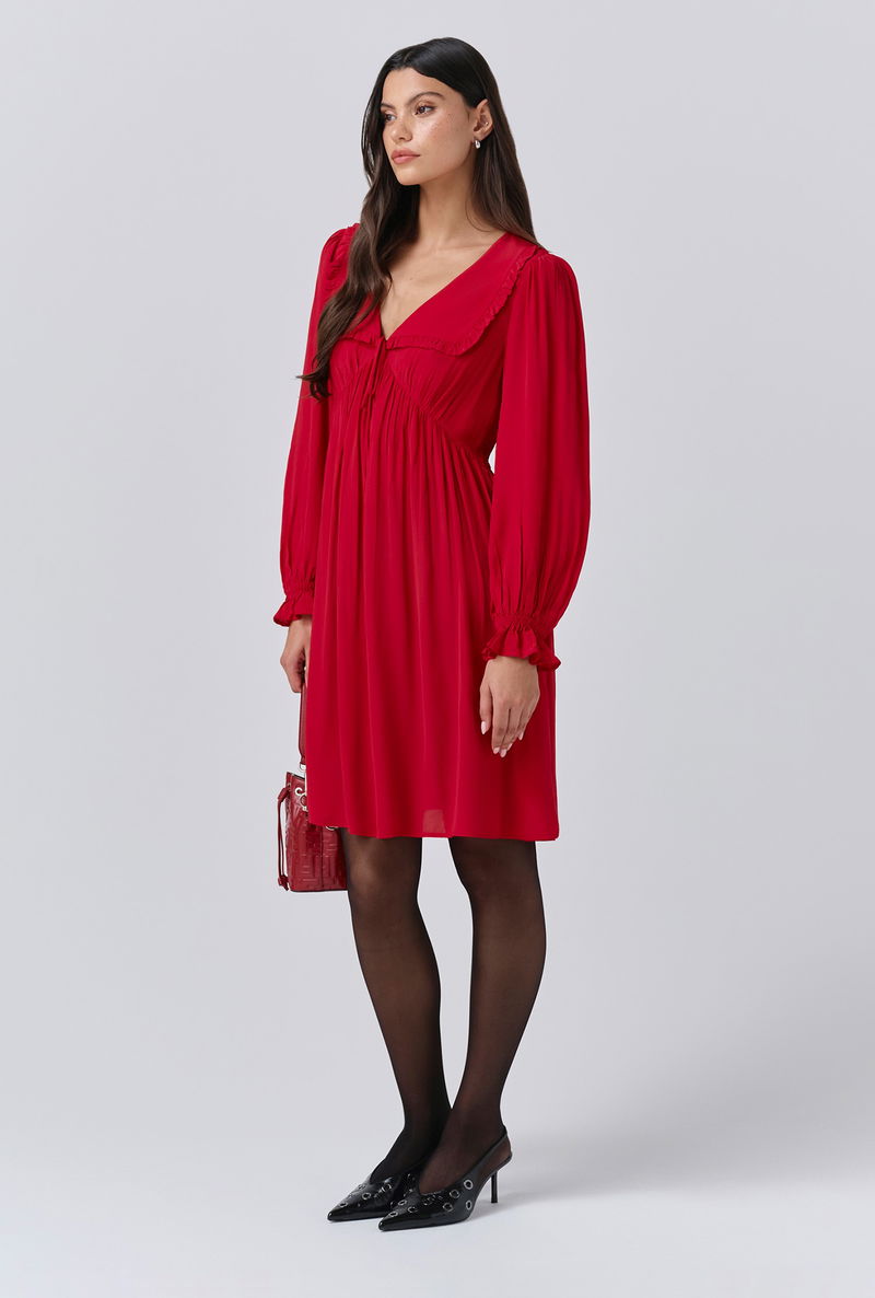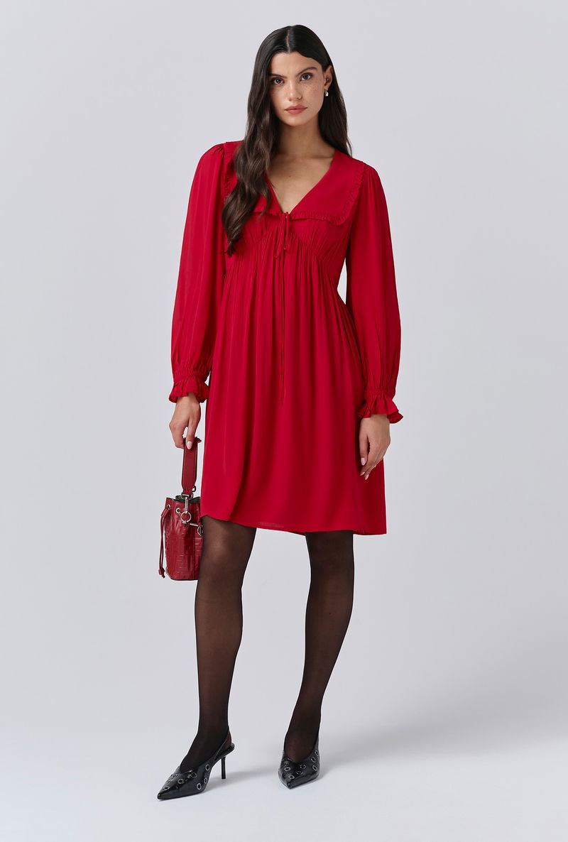 A pop of red is an effortless way to make an impact, that’s why we created Bianca, a mini dress that’s as bold as it is beautiful. Featuring a statement collar, long sleeves with a frilled cuff and a flattering empire line cut, it’s crafted from lightweight crepe fabric to ensure maximum ease of wear, whatever the occasion.