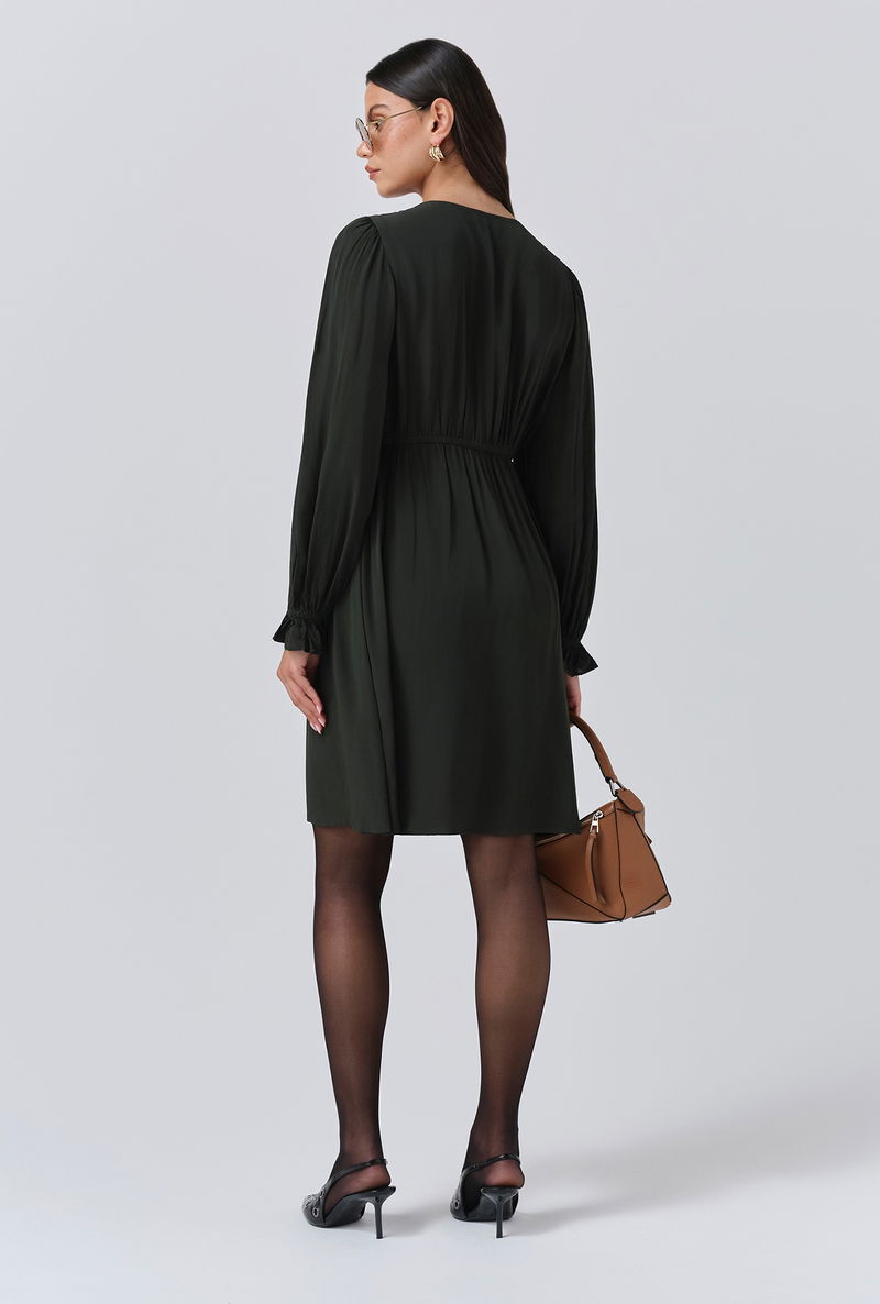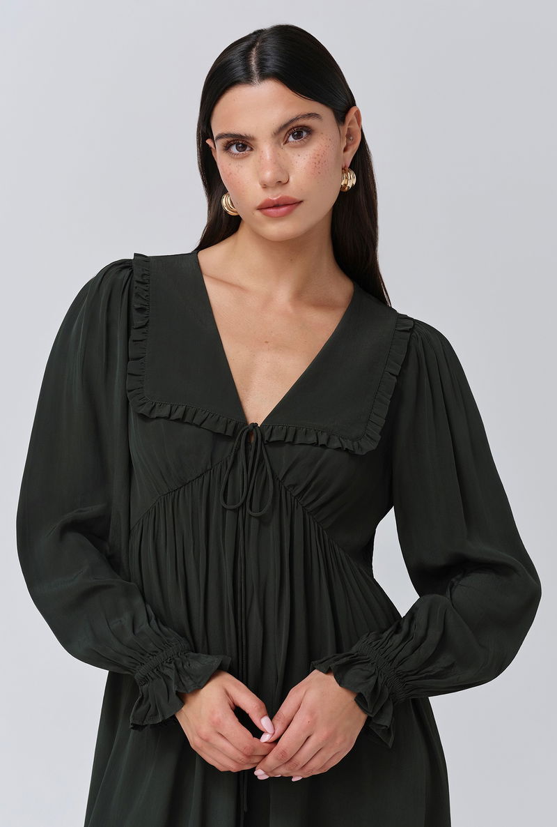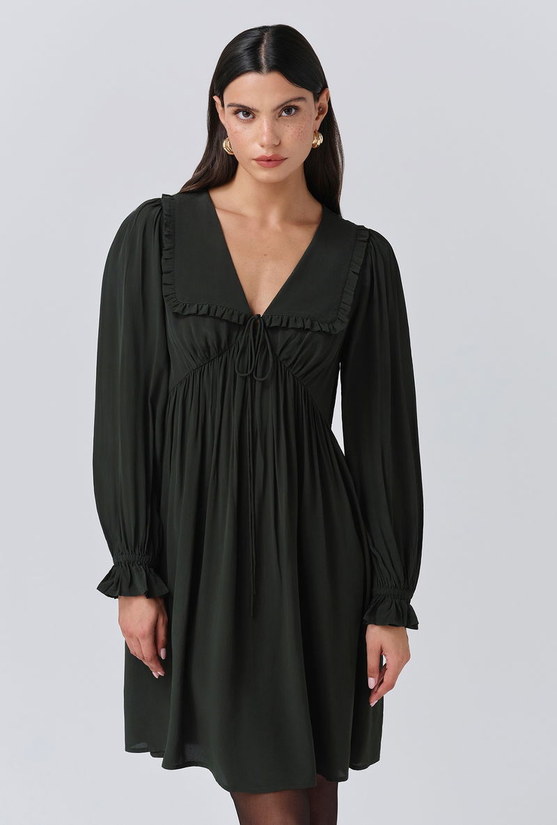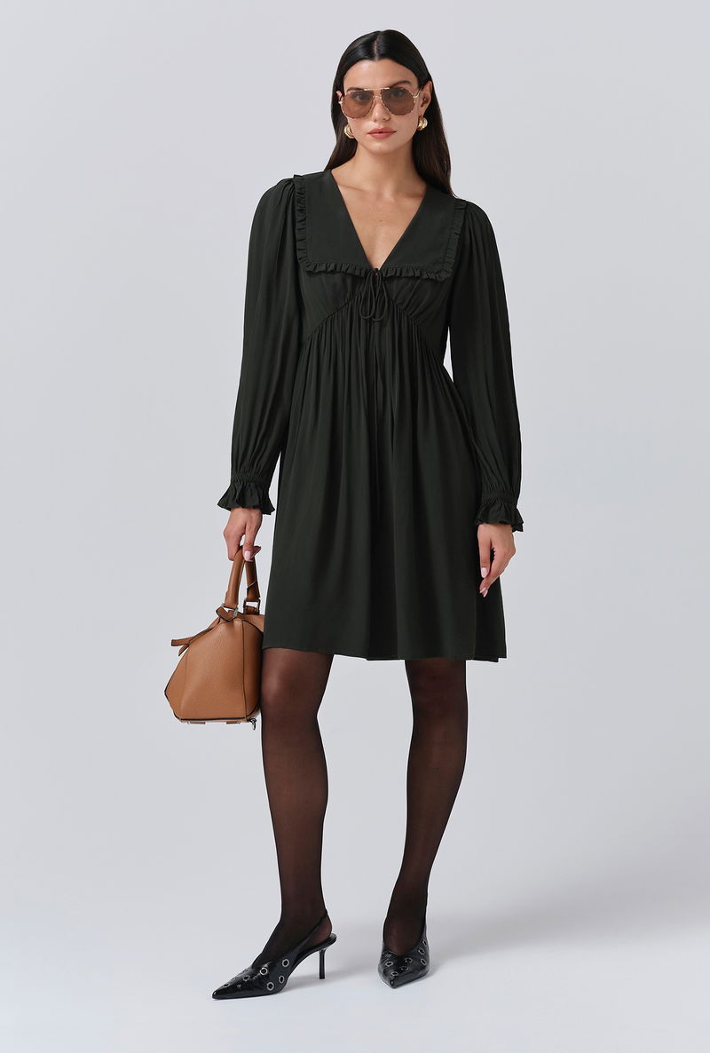 A pop of green is an effortless way to make an impact, that’s why we created Bianca, a mini dress that’s as bold as it is beautiful. Featuring a statement collar, long sleeves with a frilled cuff and a flattering empire line cut, it’s crafted from lightweight crepe fabric to ensure maximum ease of wear, whatever the occasion.