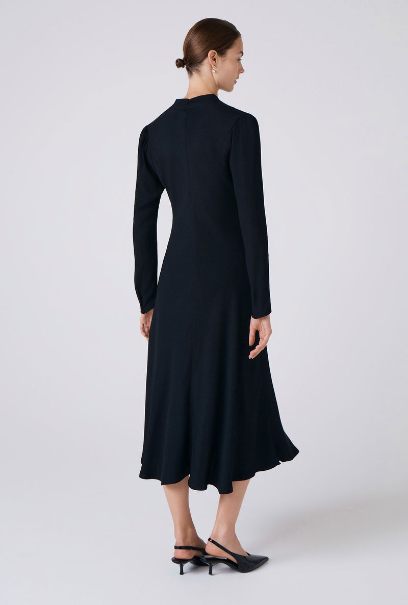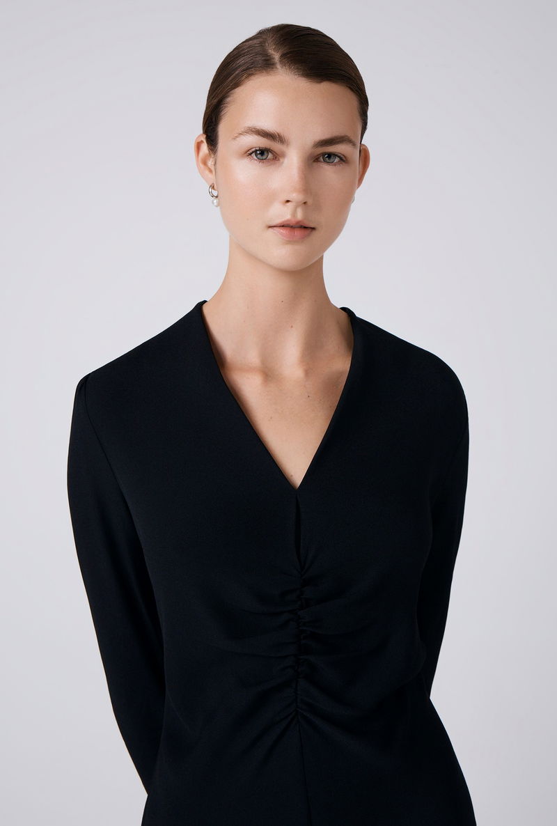 Cecelia is all about the subtle details. We’ve added ruching at the front to give this minimalist piece a softly demure twist. Crafted from smooth crepe for a flattering drape, it features full-length sleeves with gentle volume at the shoulder and is cut to fit close to the body.