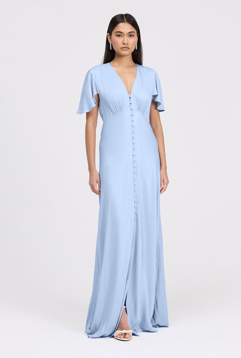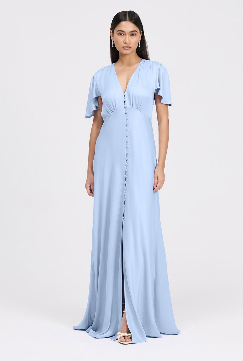 The Delphine button up dress is a satin maxi designed for bridesmaids and special occasions. Featuring a flattering v-neckline, soft angel sleeves, and a bias-cut silhouette. Skims the body elegantly while offering graceful coverage at the shoulders. A button-through front adds subtle detail, and the maxi length ensures timeless sophistication, making Delphine a polished V-neck bridesmaid dress and versatile maxi bridesmaid dress option.