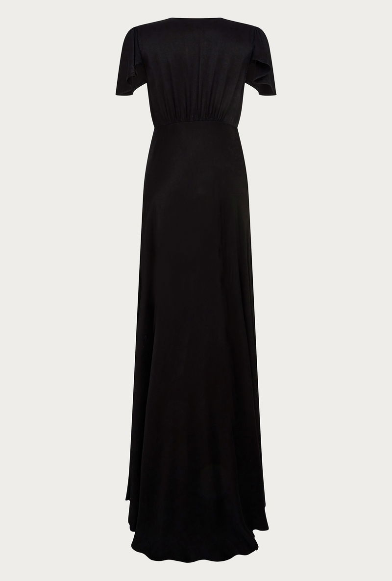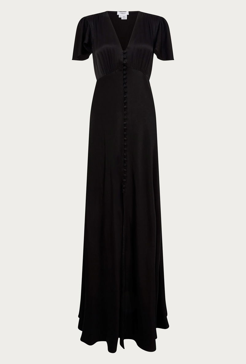 Vintage-like in silhouette and style, the Delphine in black is a timeless design. Cut into a gentle V-neck, its button-through front gives way to a split to create movement whilst walking and to showcase your choice of shoes and finishes with a train hem. Gathered detail around the shoulders and under the bust adds to its feminine appeal. Made from heavy satin fabric obtained from sustainable sources, it is cut on the bias for a flattering fit.