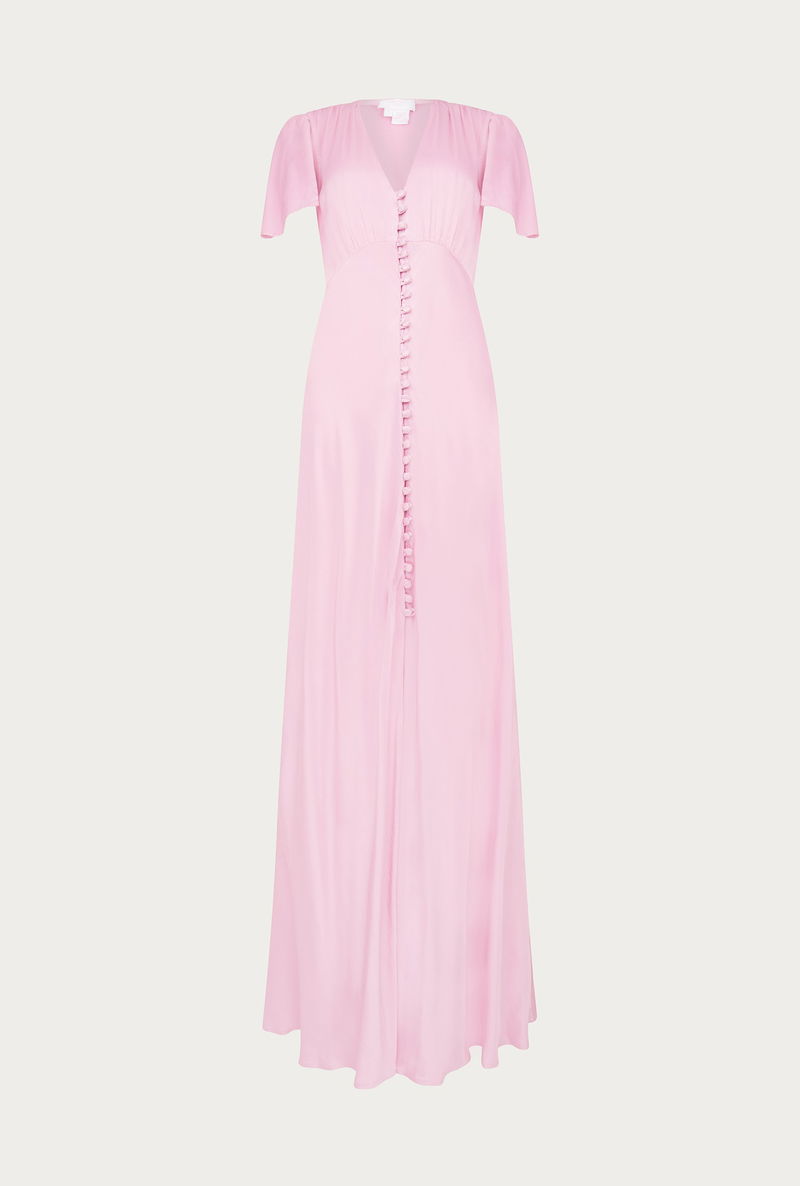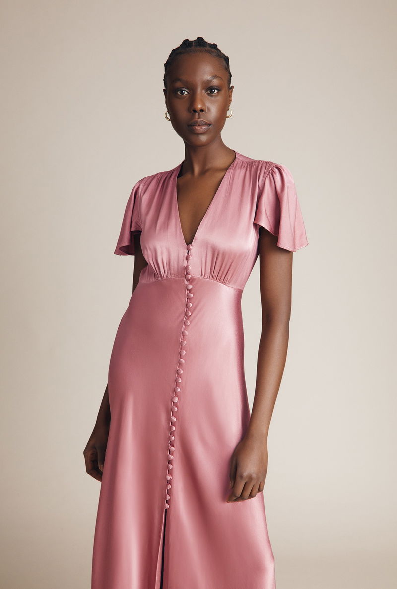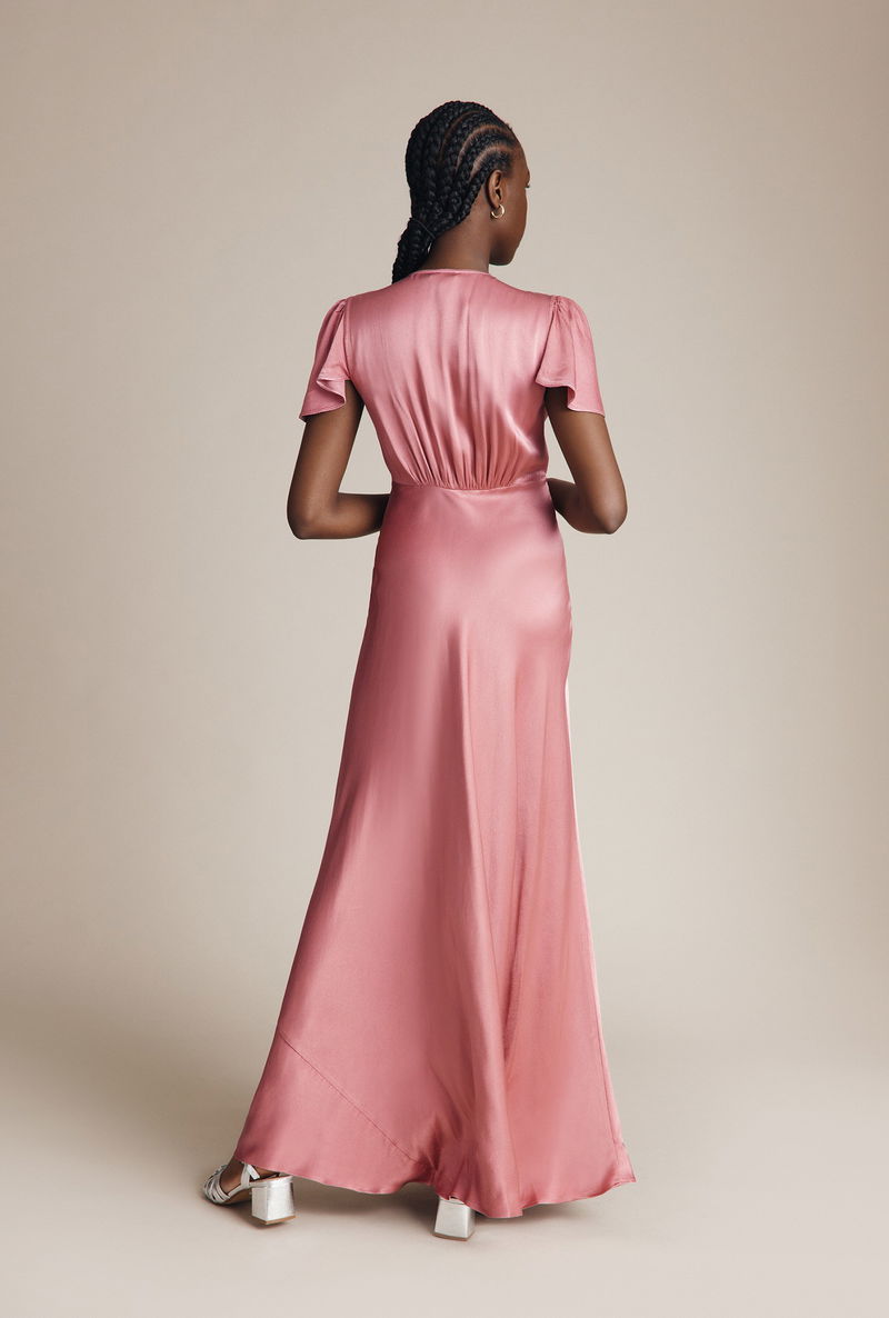 Vintage-like in silhouette and style, the Delphine in pink is a timeless design. Cut into a gentle V-neck, its button-through front gives way to a split to create movement whilst walking and to showcase your choice of shoes and finishes with a train hem. Gathered detail around the shoulders and under the bust adds to its feminine appeal. Made from heavy satin fabric obtained from sustainable sources, it is cut on the bias for a flattering fit. Delphine is an occasion-wear must-have and would make a perfect bridesmaid dress.